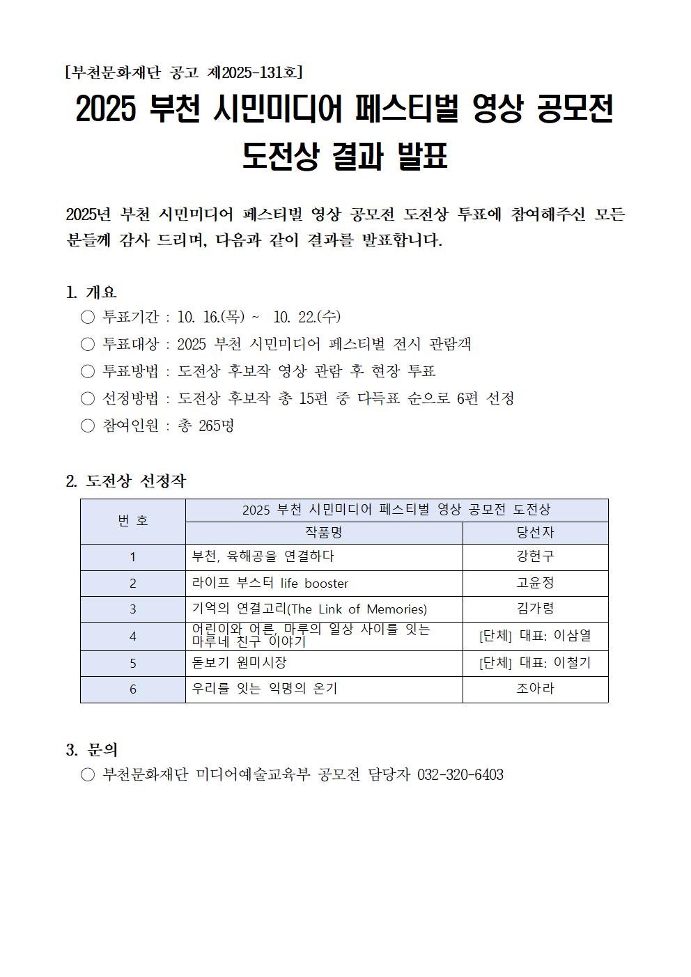 [공고 제2025-131호] 2025 부천 시민미디어 페스티벌 영상 공모전 도전상 결과 발표 구분 발표 작성자 미디어예술교육부 작성일 2025.10.23 조회수 1751 파일 목록 이전 글 2025년 부천문화재단 문화정책 포럼 개최 및 신청 안내 부천문화재단 이해충돌방지제도 시행 안내 다음글