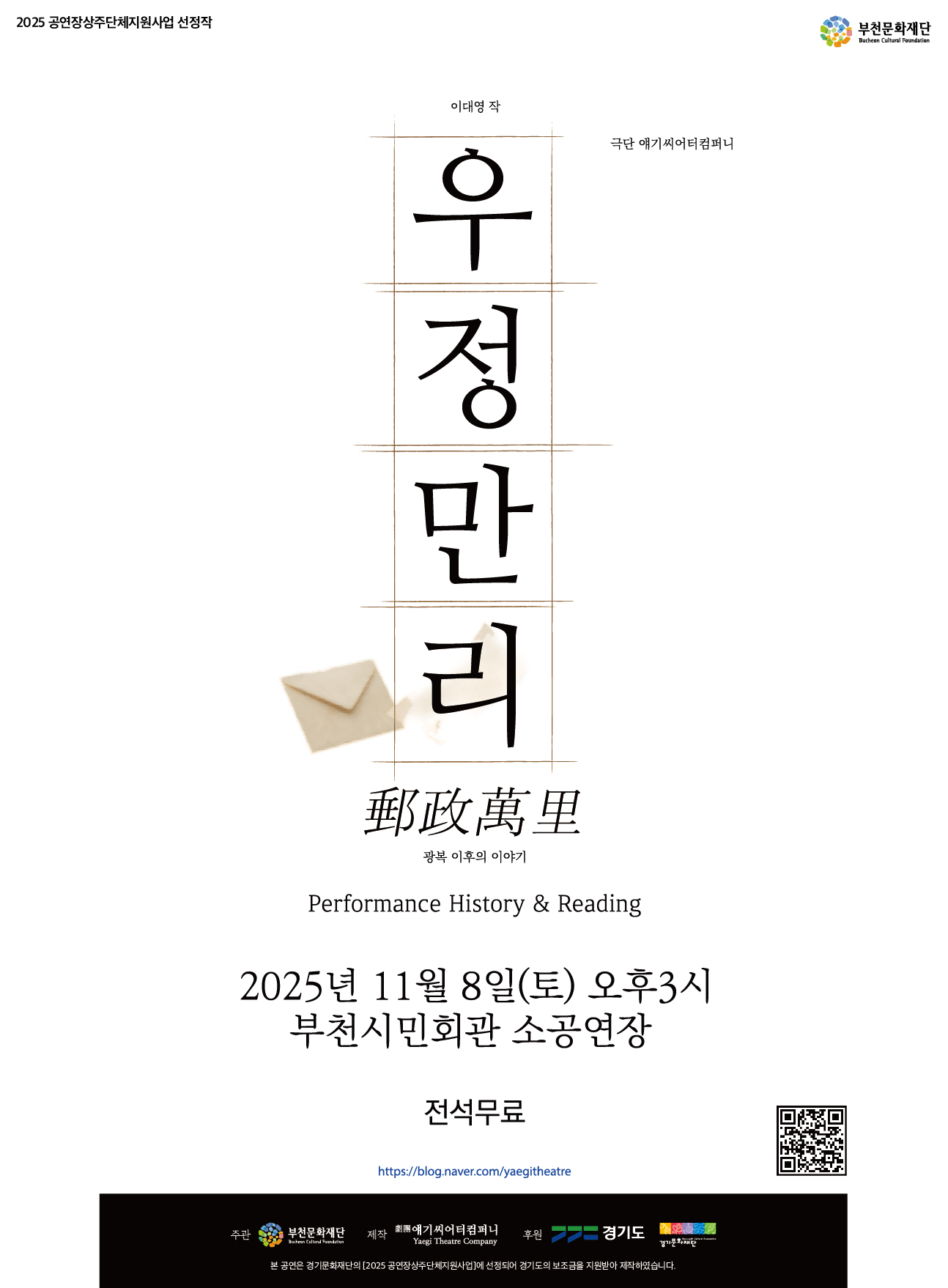 [공연장상주단체지원사업] 낭독극 <우정만리> 공연안내 구분 공연 작성자 공연기획운영부 작성일 2025.11.02 조회수 334 대한민국 100년을 헤쳐나간 우편집배원 3대 이야기를 담은 연극.백여 년 전 일제치하를 살아온 집배원 3대 가족의 이야기.'우정만리’는 얘기씨어터컴퍼니의 창작극으로,지난 2021년 경기문화재단의 문화예술제작지원사업으로 선정됐다.‘벙거지꾼 계동이’라는 제목으로 초연했고,지난해에는 한국문화예술위원회 원로예술인 공연지원사업에 선정돼성황리에 공연된 바 있다. https://booking.naver.com/booking/12/bizes/1017496 파일 목록 이전 글 2025 문화예술교육지원사업 <우리 동네 예술단> 작품발표회 안내 [부천문화특화구역] 까치울역카페거리 협력상점 안내 다음글