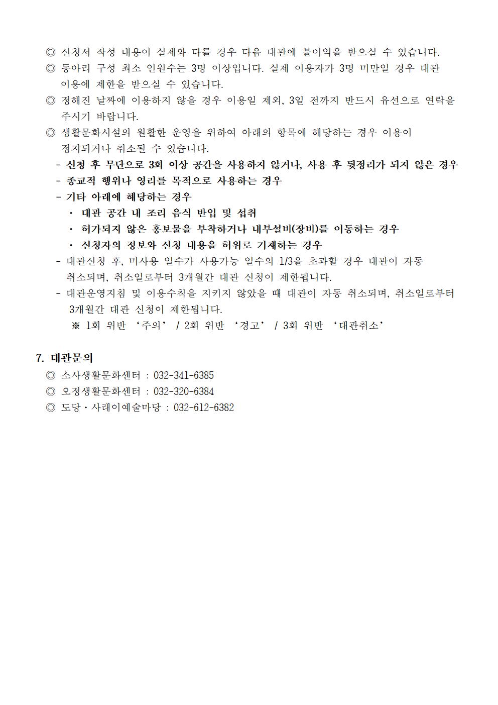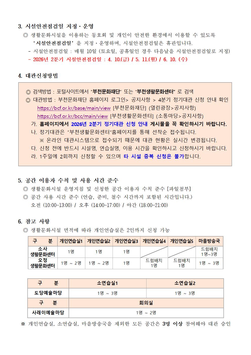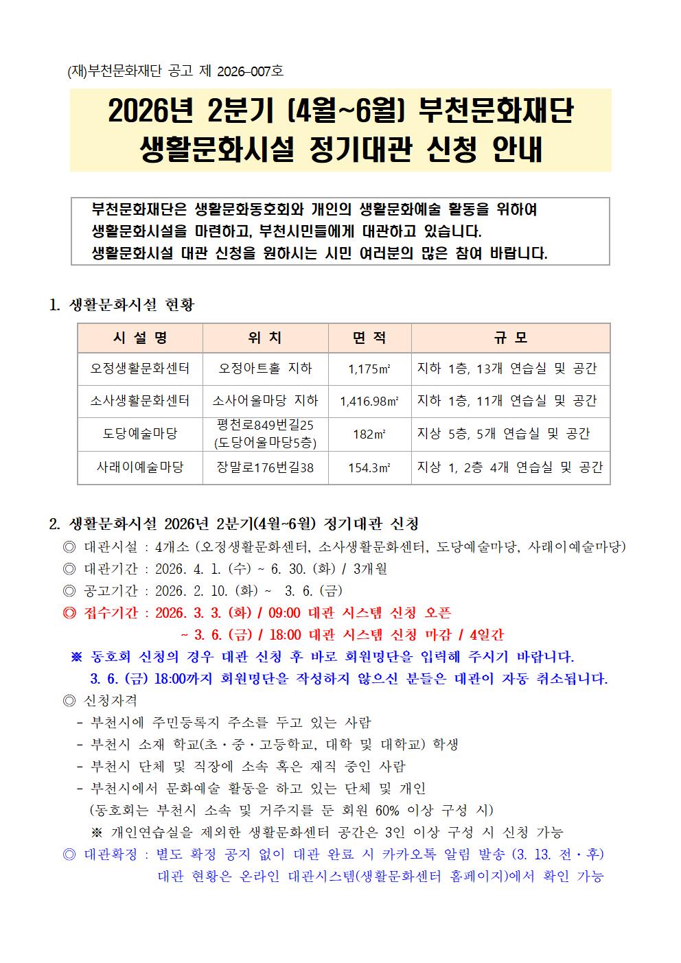 [공고 제2026-007호] 2026년 2분기 (4월~6월) 부천문화재단 생활문화시설 정기대관 신청 안내 구분 모집 작성자 시민문화진흥부 작성일 2026.01.23 조회수 17622 파일 붙임1. 생활문화시설 이용자 수칙.pdf 다운로드 붙임2. 생활문화시설 운영지침(2025.8.28.).pdf 다운로드 목록 이전 글 [공고 제2026-006호] 2026 부천문화재단 부천공연예술연습공간 단시간(시간제)근로자 채용 공고 [공고제2026-008호]2026년 생활문화시설 공간 운영을 위한 단시간(시간제)근로자 최종합격자 공고 다음글