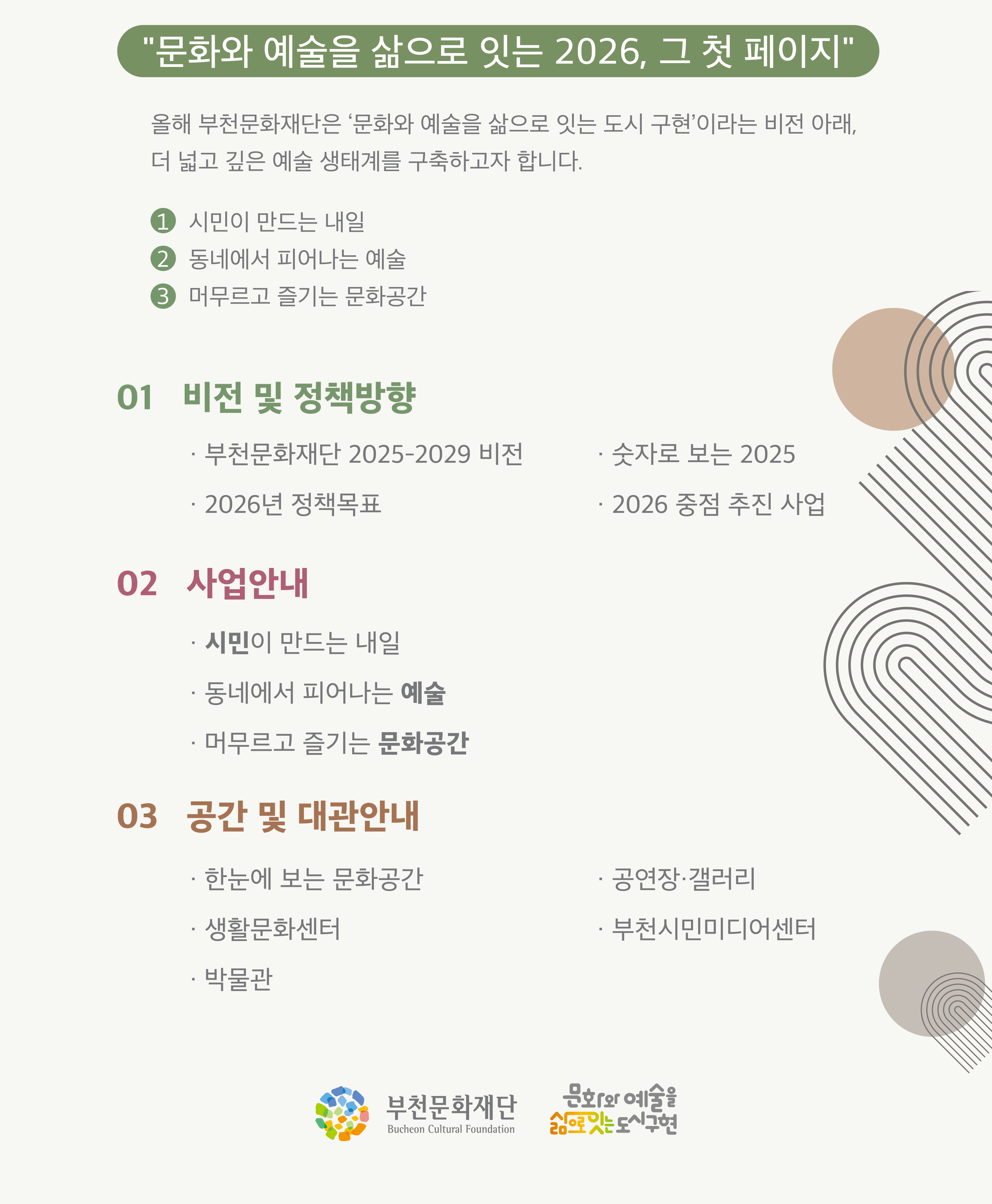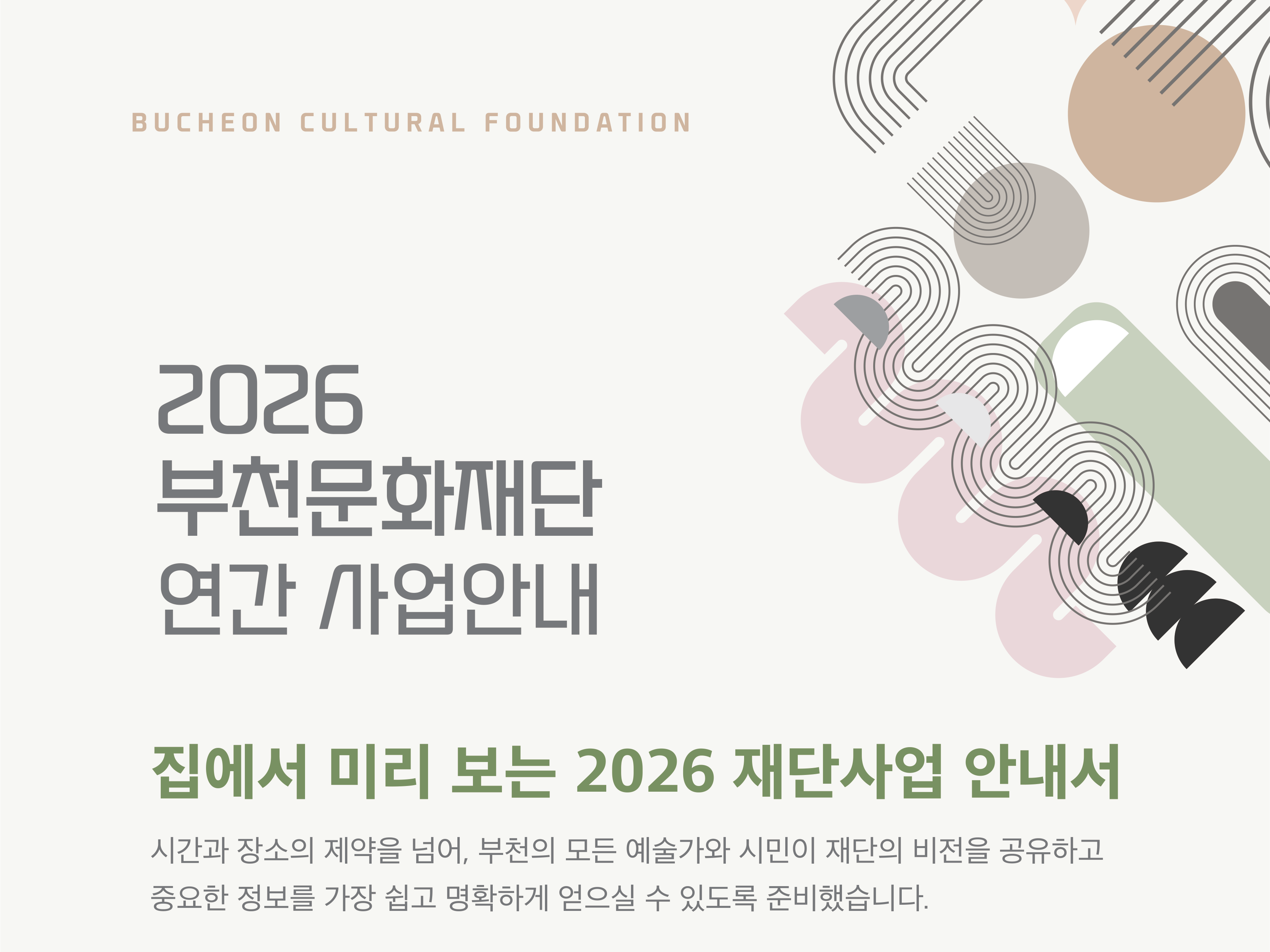 2026년 부천문화재단 연간 사업안내 구분 행사 작성자 부천문화재단 작성일 2026.02.02 조회수 18552 시민 누구나 쉽게 이용할 수 있도록 본 사업안내는 온라인으로 진행되며, 시각정보 이해를 돕는 음성해설 영상도 함께 제작·제공합니다. 파일 목록 이전 글 [공고 제2026–009호] 2026 부천시립박물관 움찬배움터 프로그램 운영자 모집 공고 2026년 부천시 협력기관 직원 통합채용시험 변경 사전예고 다음글