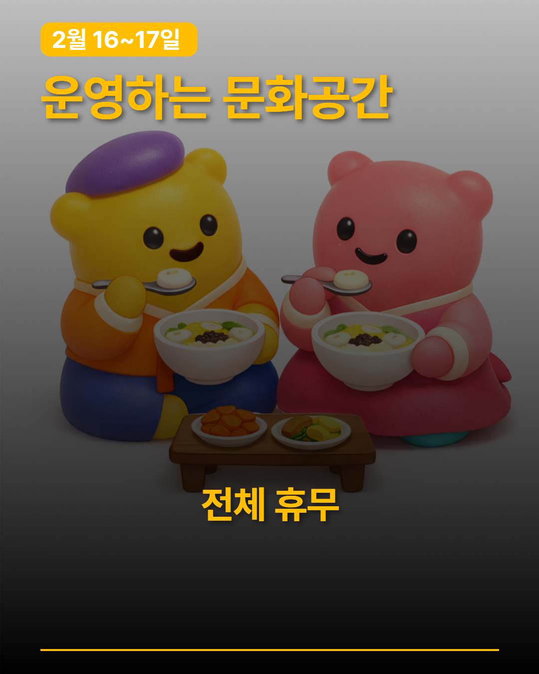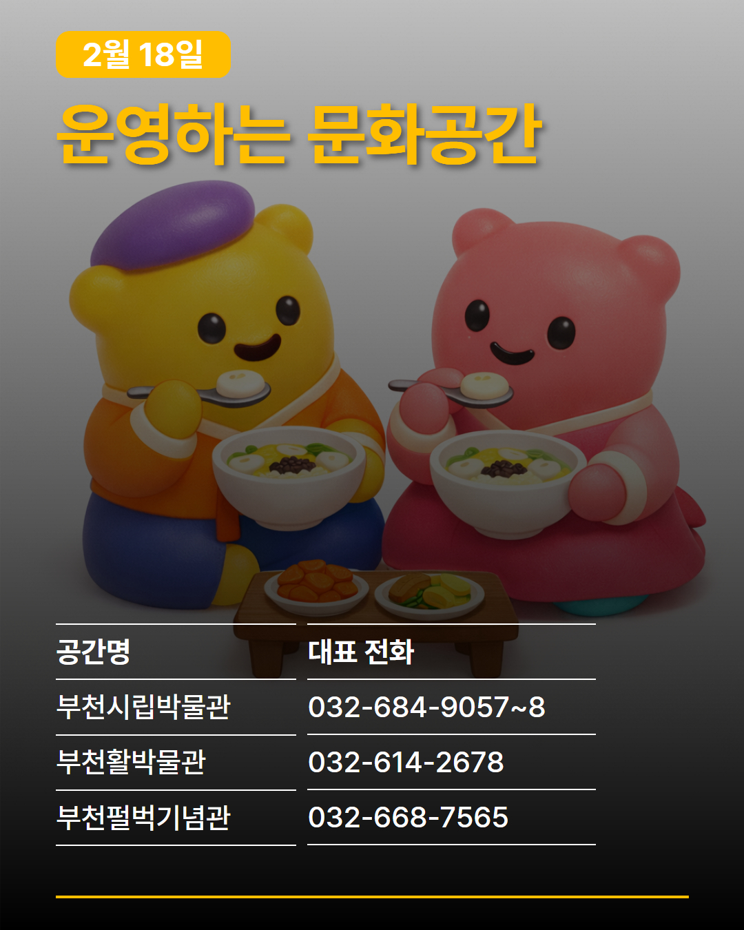 2026 설 연휴 재단 공간 운영 안내 구분 행사 작성자 부천문화재단 작성일 2026.02.09 조회수 10880 새해 복 많이 받으시고, 행복한 설 명절 보내세요🙇♀️설날 연휴 재단 공간 운영 안내드립니다🔔 📌2월 16일(월)~17일(화): 전체 휴무 📌2월 18일(수) 운영 공간: 부천시립박물관 부천활박물관 부천펄벅기념관 파일 목록 이전 글 2026년 4월 어린이공연 단체관람 신청안내 [공고 제2026–013호] 2026 부천시립박물관 움찬배움터 프로그램 운영자 서류심사 결과발표 및 면접심사 안내 다음글