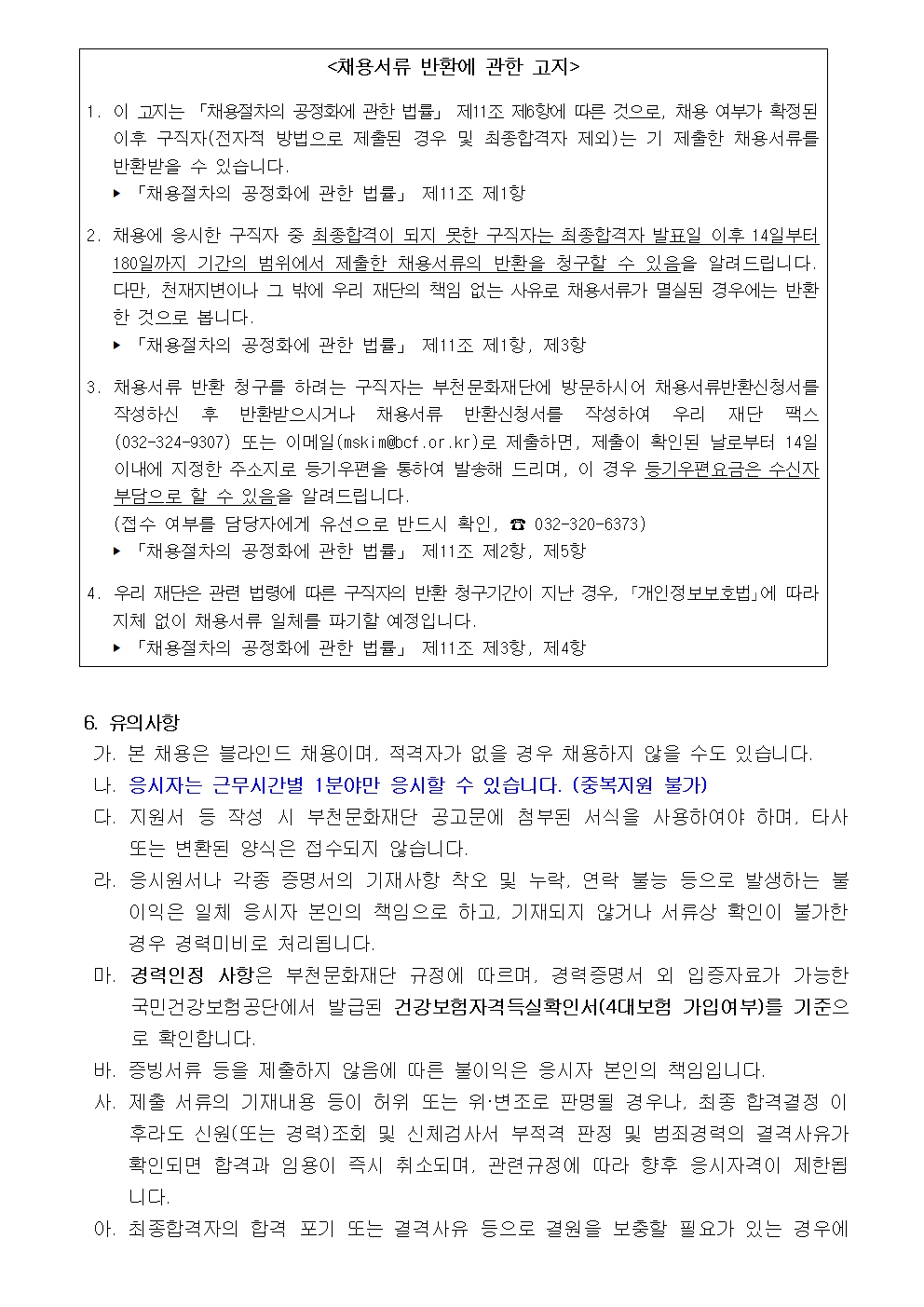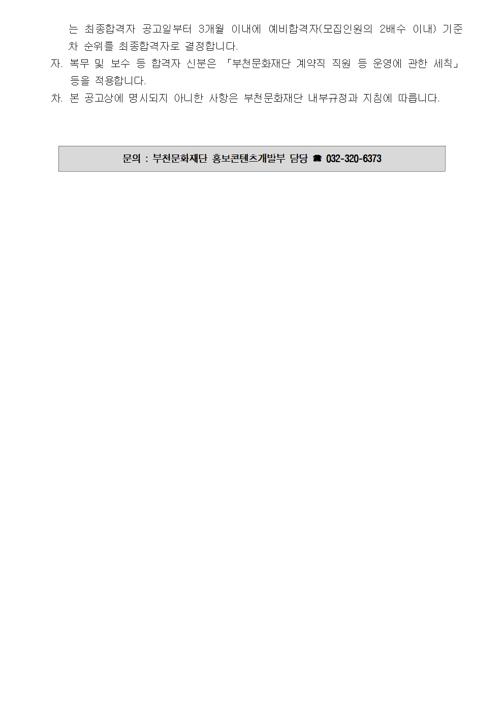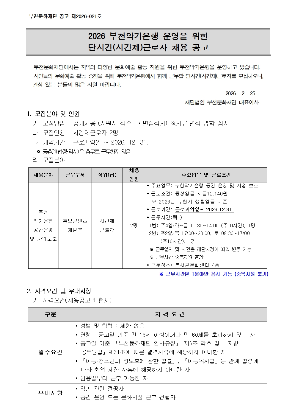 [공고 제2026-021호] 2026 부천악기은행 단시간(시간제)근로자 채용 공고 구분 채용 작성자 부천문화재단 작성일 2026.02.24 조회수 6156 파일 01.채용공고문(안).pdf 다운로드 02.입사지원서_양식.hwp 다운로드 03.대상자별 가점기준.pdf 다운로드 04. 채용서류 반환청구서.hwp 다운로드 목록 이전 글 [공고 제2026-020호] 부천문화재단 임원 공개모집 최종합격자 공고 2026 삼일절 재단 공간 운영 안내 다음글