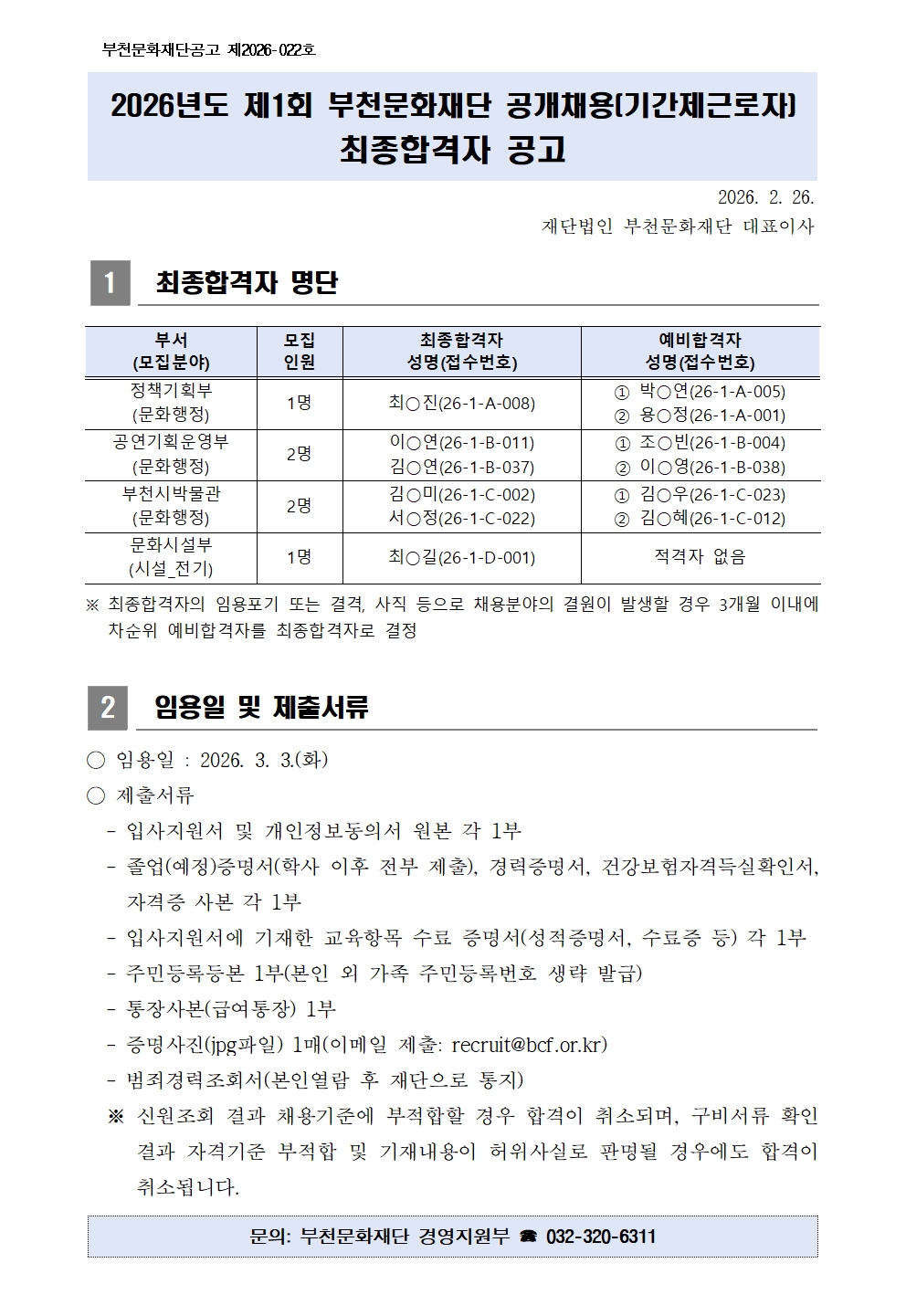 [공고 제2026-022호] 2026년도 제1회 부천문화재단 공개채용(기간제근로자) 최종합격자 공고 구분 채용 작성자 경영지원부 작성일 2026.02.26 조회수 5001 파일 목록 이전 글 2026 삼일절 재단 공간 운영 안내 [공고 제2026-023호] 「2026 문화정책협의체-시민랩」 모집 공고 다음글