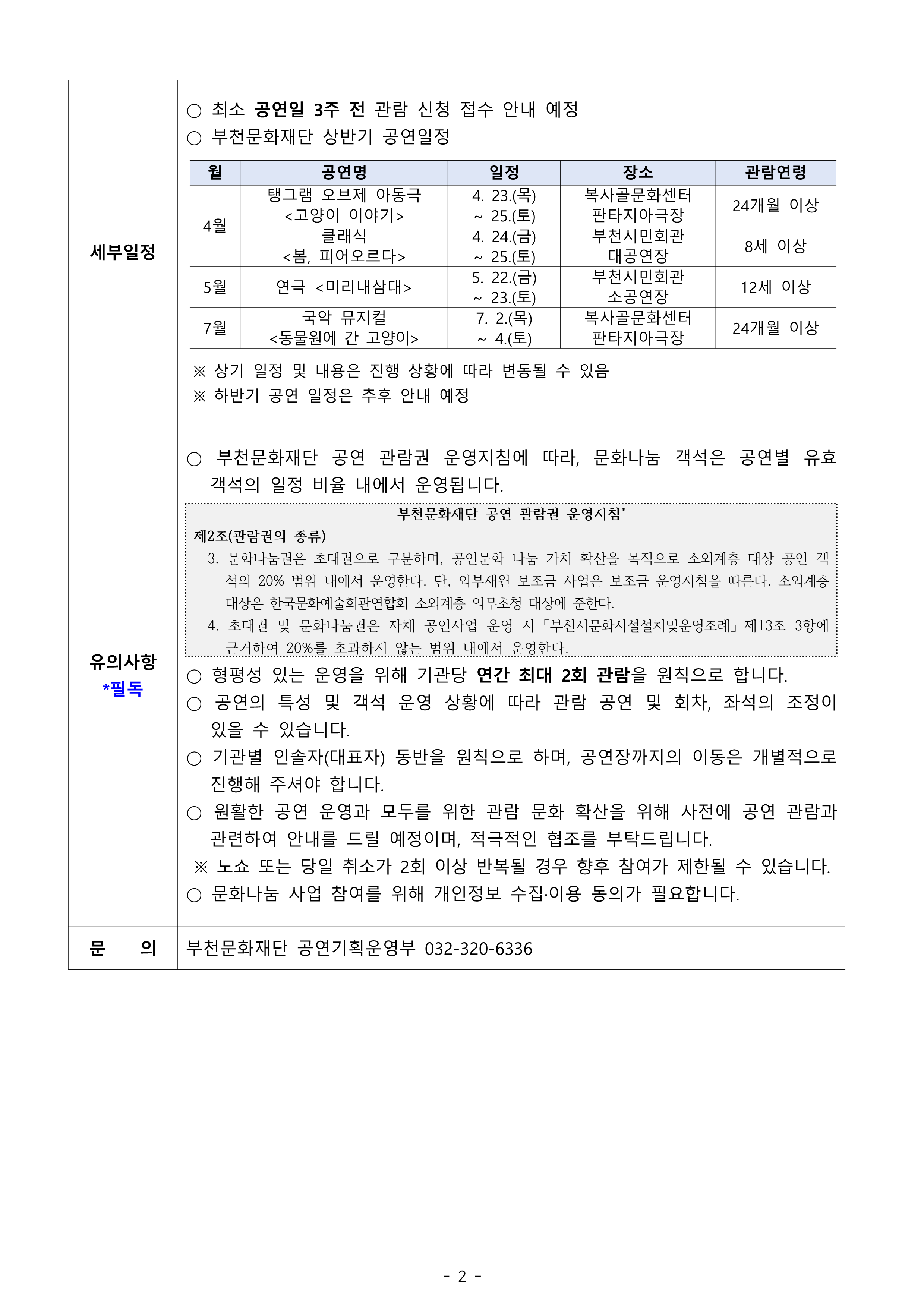 [공고 제2026-34호] 2026년 문화나눔 <공연함께보기> 참여기관 모집 공고 구분 모집 작성자 공연기획운영부 작성일 2026.03.20 조회수 6017 >>온라인 신청서 바로가기 (클릭)<< 파일 2026년 문화나눔 참여기관 모집 공고.pdf 다운로드 목록 이전 글 [공고 제2026-32호] 부천문화재단 공연장 안내원(시간제근로자) 5기 최종합격자 공고 2026 지역영상인력 제작지원사업 <부천 필름메이커스> 모집 공고 다음글