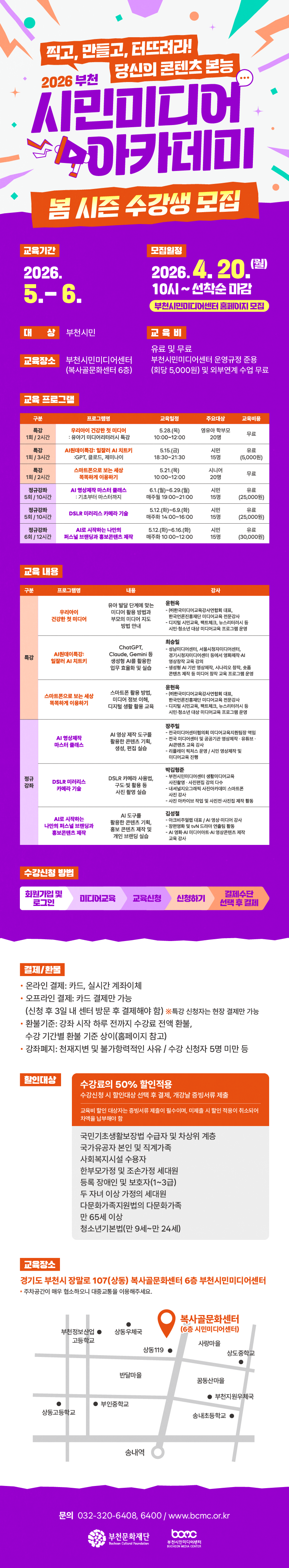 2026 부천 시민미디어 아카데미 봄시즌 수강생 모집 구분 모집 작성자 시민문화진흥부 작성일 2026.04.08 조회수 78 파일 목록 이전 글 [수주문학관] 책과 함께 잠시 기대어 쉬는 곳, 수주 북클럽 <그늘>로 초대합니다