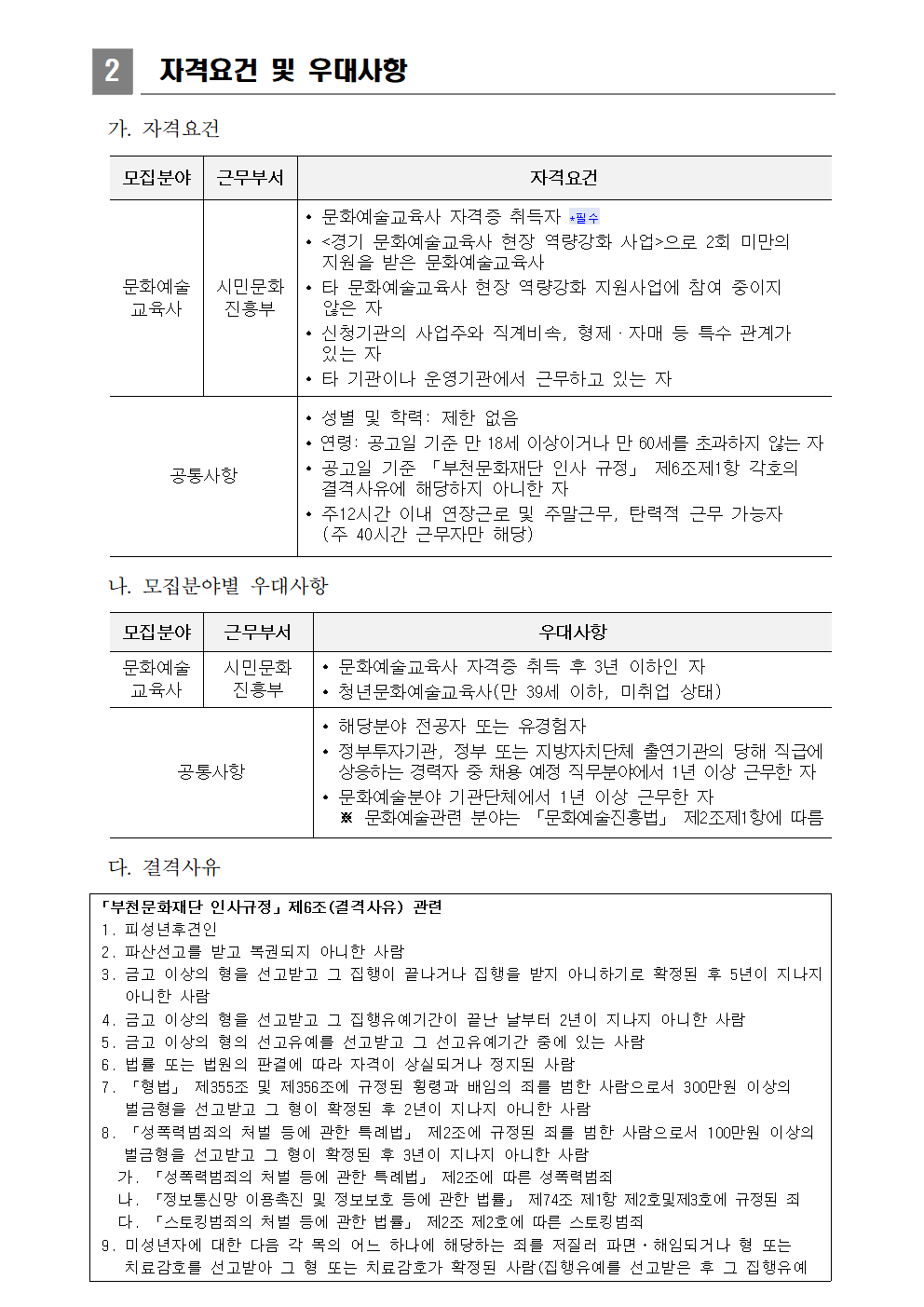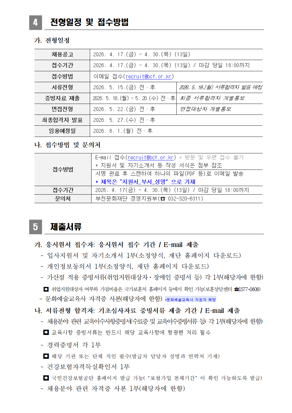 [공고 제 2026-42호] 2026년도 제2회 부천문화재단 공개채용(기간제근로자) 모집 공고 구분 채용 작성자 경영지원부 작성일 2026.04.17 조회수 275 파일 붙임1. 2026 제2회 부천문화재단_기간제근로자_채용공고(안).hwp 다운로드 붙임2. 입사지원서 및 자기소개서 등.hwp 다운로드 붙임3. 채용서류 반환청구서.hwp 다운로드 목록 이전 글 [공고 제2026-44호] 2026 시민미디어 활동지원 사업 최종심사 결과 안내