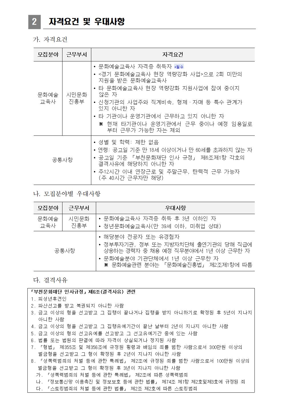 [공고 제 2026-42호] 2026년도 제2회 부천문화재단 공개채용(기간제근로자) 모집 공고 구분 채용 작성자 경영지원부 작성일 2026.04.17 조회수 4241 파일 붙임1. 2026 제2회 부천문화재단_기간제근로자_채용공고(안)수정.hwp 다운로드 붙임2. 입사지원서 및 자기소개서 등.hwp 다운로드 붙임3. 채용서류 반환청구서.hwp 다운로드 목록 이전 글 [공고 제2026-44호] 2026 시민미디어 활동지원 사업 최종심사 결과 안내 [경기콘텐츠진흥원] 2026 경기북부발전 1인 크리에이터 모집 다음글