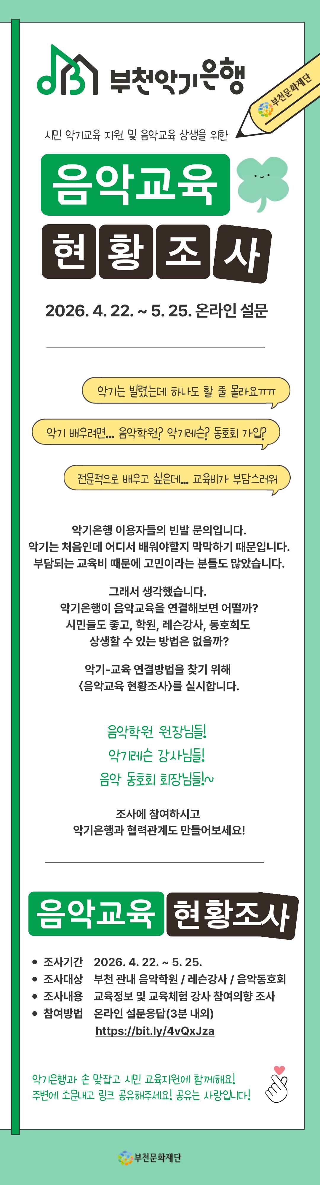[부천악기은행] 시민교육지원 및 음악교육계 상생을 위한 〈음악교육 현황조사〉 구분 모집 작성자 부천문화재단 작성일 2026.04.24 조회수 937 파일 목록 이전 글 [공고 제2026-46호] 2026 모든예술31 경기예술활동지원 <부천예술찾기 미로美路> 최종 선정 결과 공고 2026-27년도 부천문화재단 어린이공연 작품공모 다음글