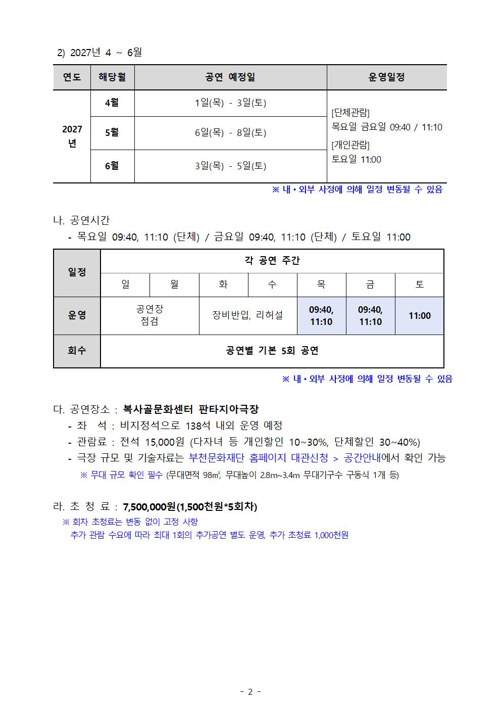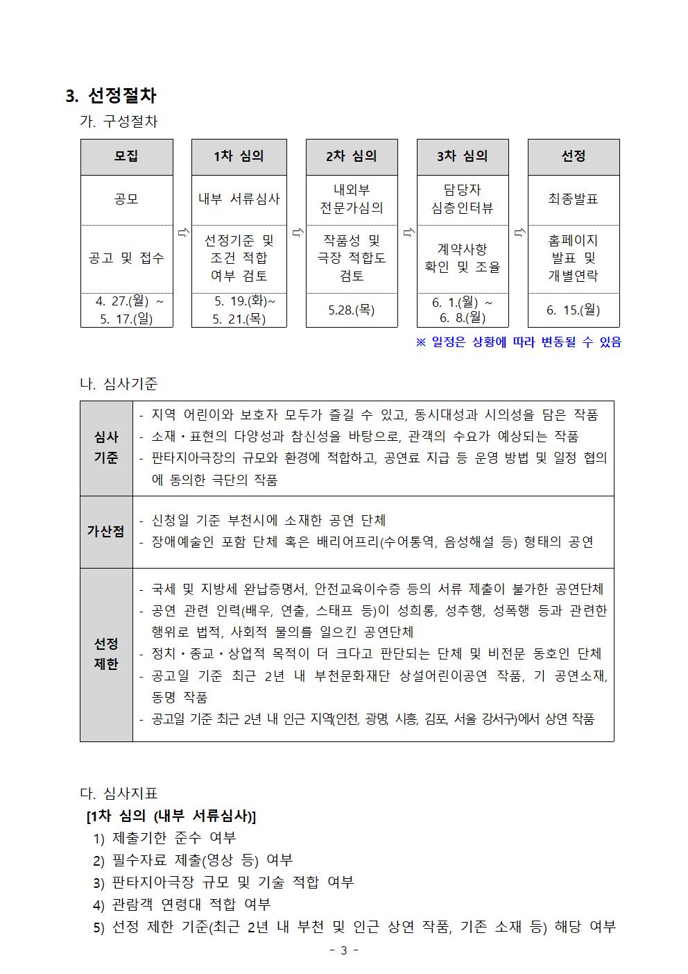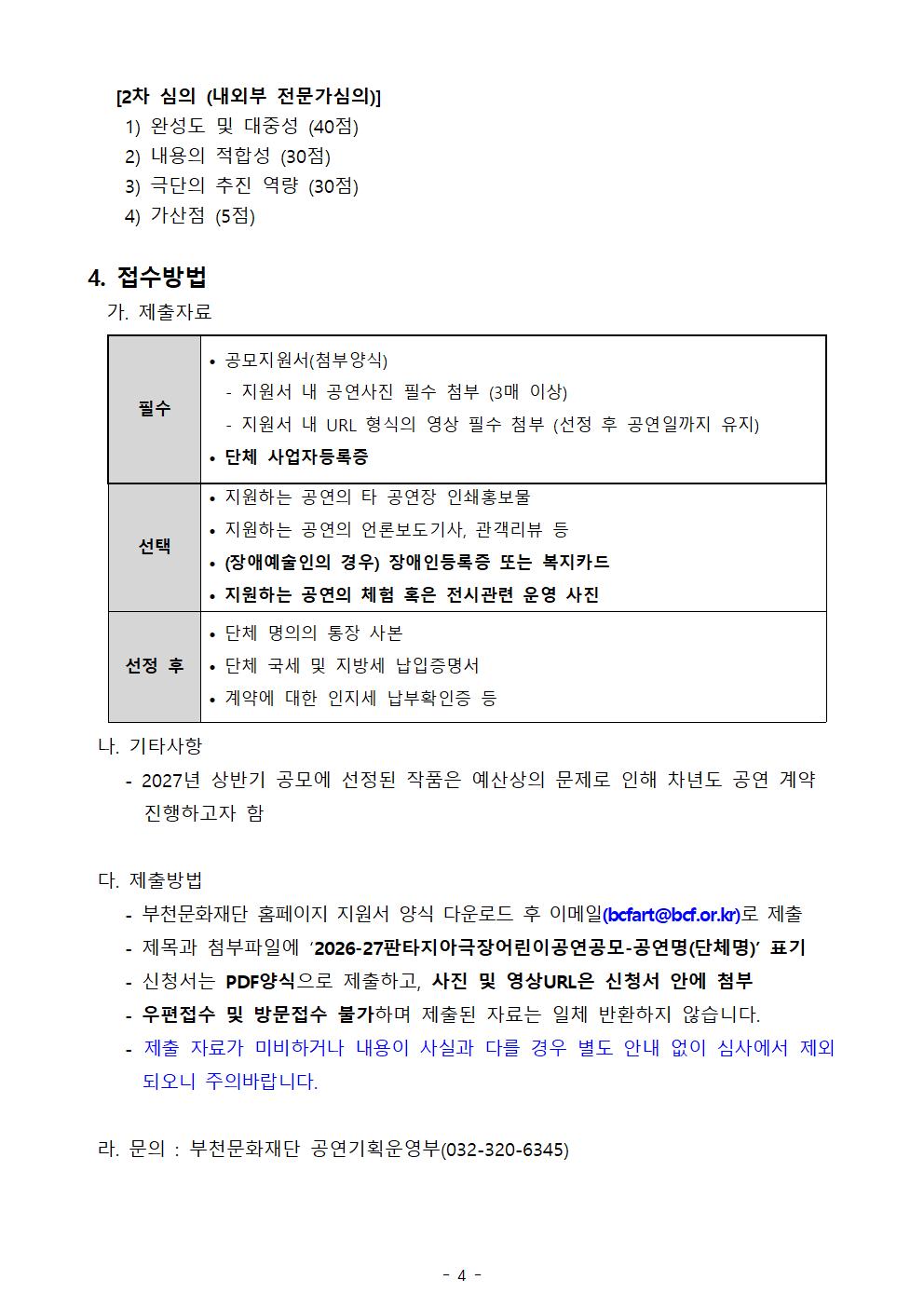 2026-27년도 부천문화재단 어린이공연 작품공모 구분 모집 작성자 공연기획운영부 작성일 2026.04.27 조회수 195 파일 2026-27년 어린이공연공모_공고문.pdf 다운로드 2026-27년 어린이공연공모_지원서.hwp 다운로드 목록 이전 글 [부천악기은행] 시민교육지원 및 음악교육계 상생을 위한 〈음악교육 현황조사〉 [공고 제2026-48호] 2026 지역영상인력 제작지원사업 <부천 필름메이커스> 1차 서류심사 결과 공고 다음글