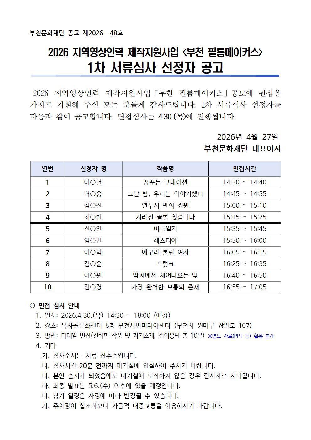 [공고 제2026-48호] 2026 지역영상인력 제작지원사업 <부천 필름메이커스> 1차 서류심사 결과 공고 구분 발표 작성자 시민문화진흥부 작성일 2026.04.27 조회수 193 기타 문의사항: 032-320-6405 파일 부천필름메이커스 1차 서류심사 선정자 공고문.pdf 다운로드 목록 이전 글 2026-27년도 부천문화재단 어린이공연 작품공모