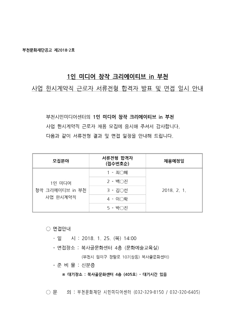 시민미디어센터 1인 미디어 창작 크리에이티브 in 부천 사업 한시계약직 근로자 서류전형 합격자 발표 및 면접 일시 안내 구분 작성자 작성일 2018.01.22 조회수 파일 목록 이전 글 (재)부천문화재단 문화진흥부서 한시계약직원(지역예술활동지원사업 운영) 모집 공고(~2. 1.) [채용]시민미디어센터 1인 미디어 창작 크리에이티브 in 부천 사업 한시계약직 근로자 서류전형 합격자 발표 및 면접 일시 안내 다음글