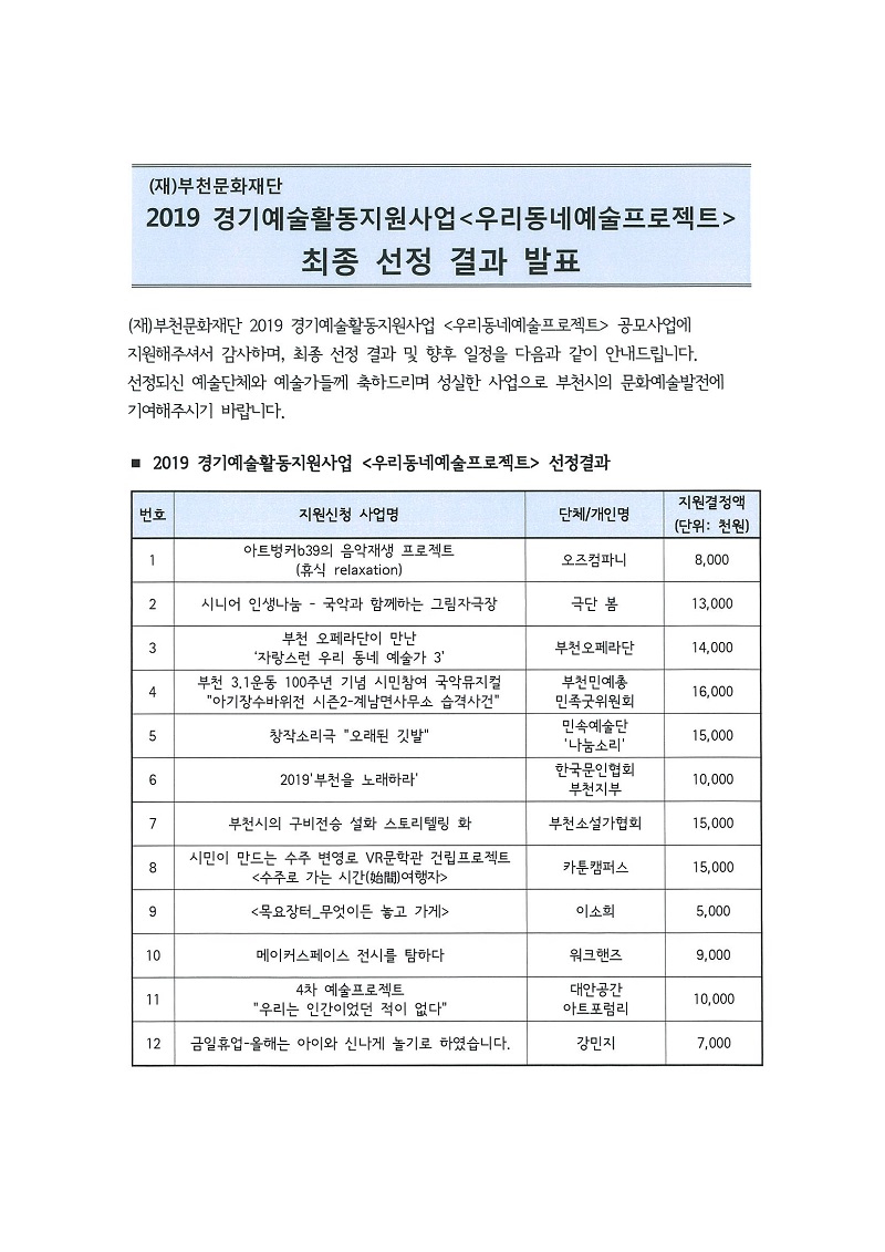 [공지] 2019 경기예술활동지원사업 <우리동네예술프로젝트> 최종 선정 결과 발표 구분 발표 작성자 작성일 2019.03.27 조회수 파일 붙임. 2019우리동네예술프로젝트 심사 총평 (1).pdf 다운로드 붙임. 2019우리동네예술프로젝트 심사 총평 (1).pdf 다운로드 목록 이전 글 [공고] 2019 문화특화지역조성사업 기간제 근로자 채용 서류전형 합격자 및 면접일정 안내 [공고] 생활문화지원센터 공간운영 시간제 근로자 최종합격자 안내 다음글