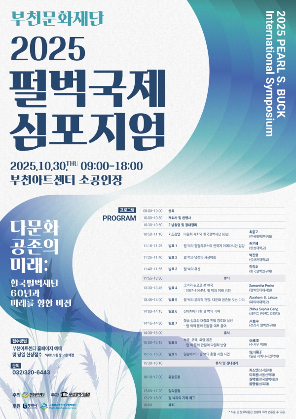 부천문화재단(대표이사 한병환)은 위대한 문학가이자 인권운동가인 펄 벅(Pearl S. Buck)의 문학 정신을 계승하고 평등 가치를 나누기 위해 오는 10월 30일(목) 오전 9시부터 오후 6시까지 부천아트센터 소공연장에서 ‘다문화 공존의 미래’를 주제로 <2025 펄벅국제심포지엄>을 개최한다.