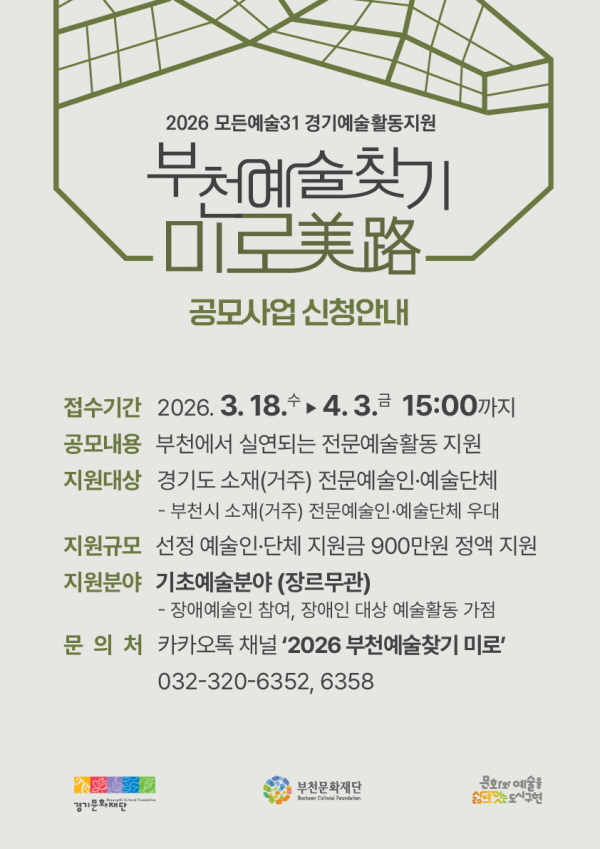 부천문화재단(대표이사 직무대행 김현아, 이하 재단)은 지역 전문예술인의 지속 가능한 창작활동을 지원하고 시민의 문화 향유 기회를 확대하기 위해 ‘2026 모든예술 31 경기문화예술활동지원 <부천예술찾기 미로(美路)>’ 사업 공모를 3월 18일부터 4월 3일 오후 3시까지 진행한다.