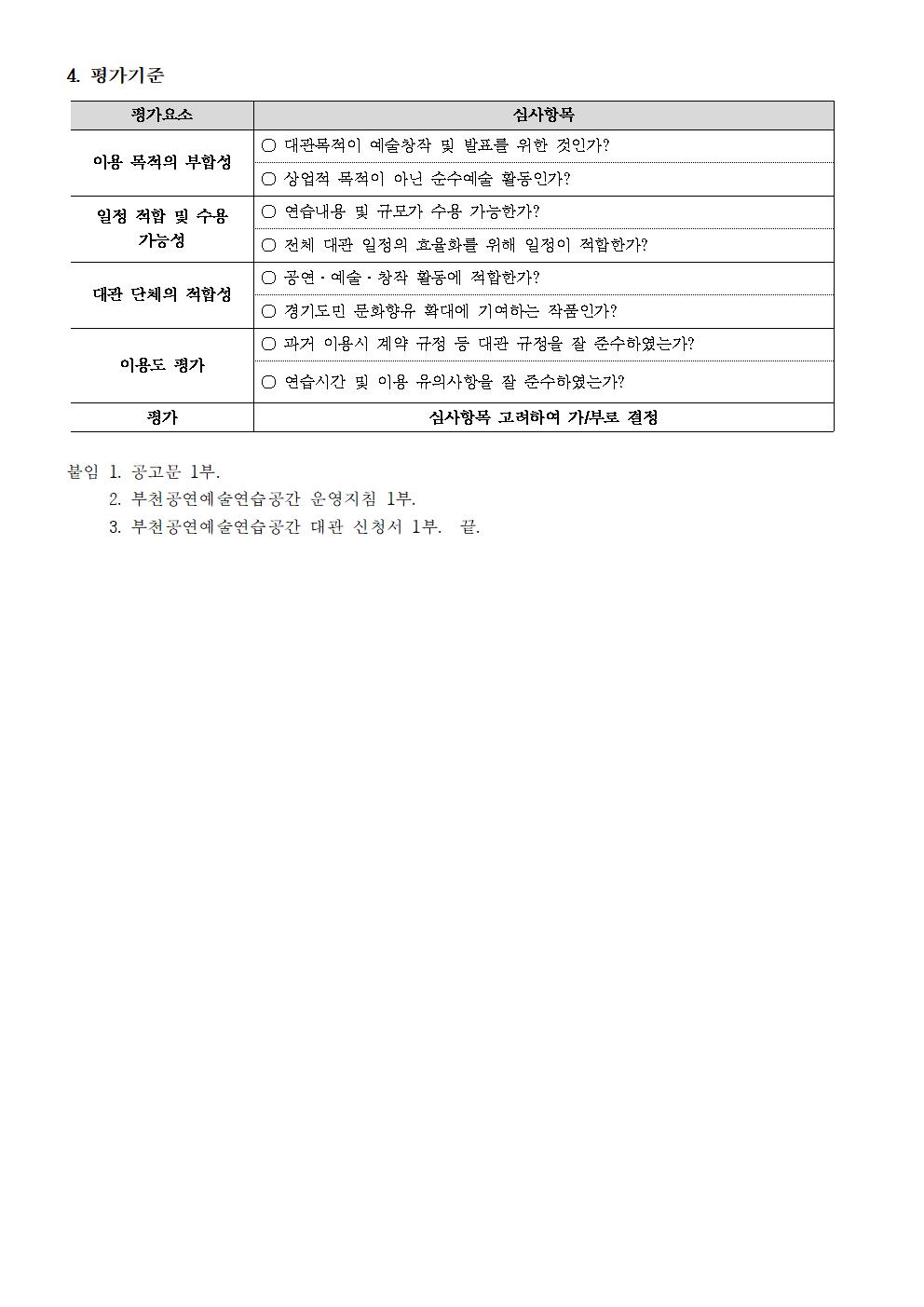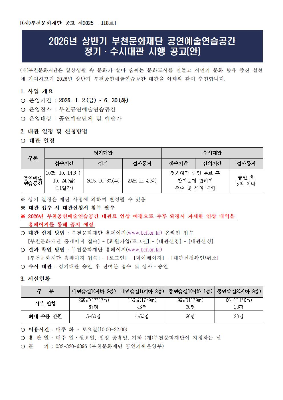 [공고 제2025-118호] 2026년 상반기 부천문화재단 공연예술연습공간 정기·수시대관 시행 공고 구분 작성자 공연기획운영부 작성일 2025.09.05 조회수 1639 파일 [붙임] 공고문.pdf 다운로드 [붙임1] 부천공연예술연습공간_운영지침_2023.11.pdf 다운로드 [붙임2] 부천공연예술연습공간_정기대관 신청서(양식).hwp 다운로드 목록 이전 글 [공고 제2025-116호] 2026년 상반기 부천문화재단 문화시설(공연장·갤러리) 대관 시행 공고 [공고 제2025-134호] 2026년도 상반기 부천문화재단 문화시설(공연장, 갤러리) 정기대관 심의 결과 공고 다음글