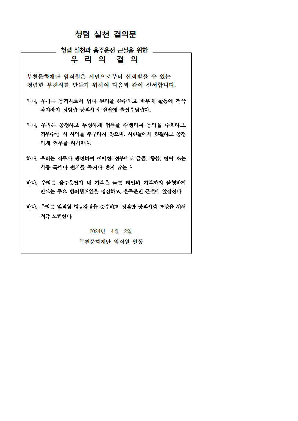 2024년 부천문화재단 청렴실천결의문 구분 청렴자료실 작성자 감사실 작성일 2024.04.15 조회수 1569 파일 부천문화재단 청렴실천결의문.hwp 다운로드 목록 이전 글 민원처리 및 이의제기 절차매뉴얼(법인취득세분야) [국민권익위원회] 공공기관 갑질에 대한 행동강령 위반행위 집중신고기간 운영 알림 다음글