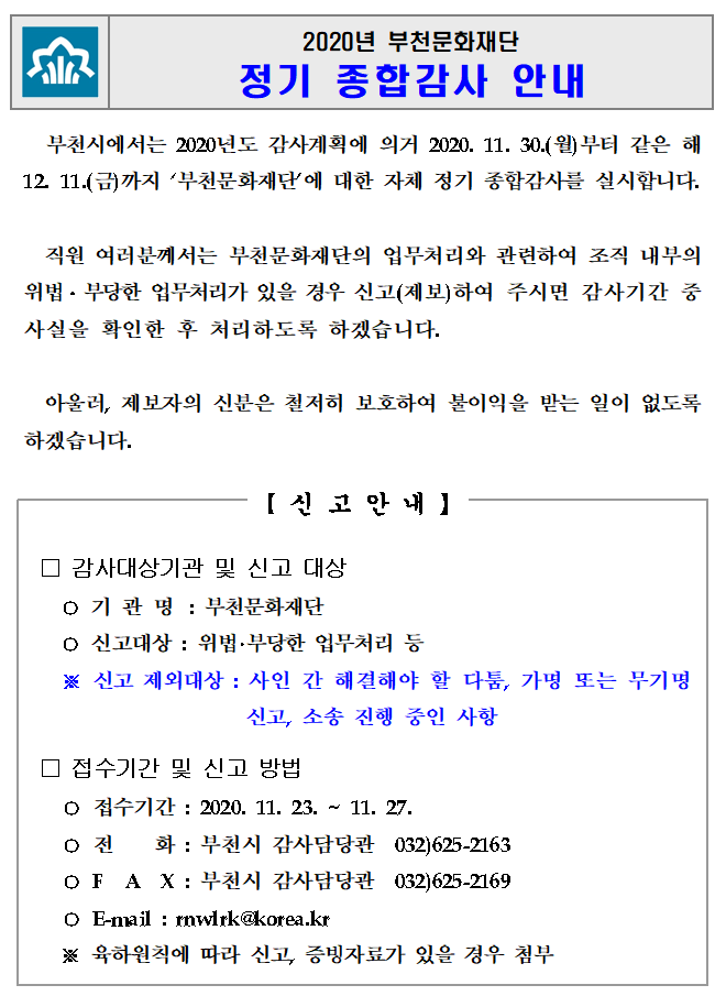 2020년 부천문화재단 정기 종합감사 안내 구분 청렴자료실 작성자 작성일 2020.11.18 조회수 파일 목록 이전 글 2020년 부천문화재단 청렴도 자체조사결과 공직선거법(카드뉴스) 안내 다음글