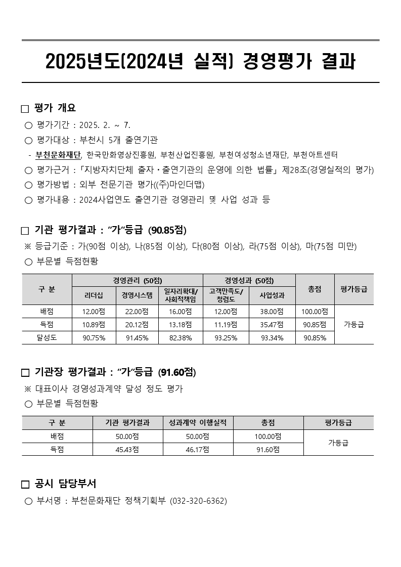 2025년(2024년 실적) 경영평가 및 기관장 성과계약 달성 결과 구분 작성자 정책기획부 작성일 2025.07.28 조회수 230 파일 2025년도(2024년 실적) 경영평가 결과보고서_공시용.pdf 다운로드 목록 이전 글 2024년(2023년 실적) 경영평가 및 기관장 성과계약 결과