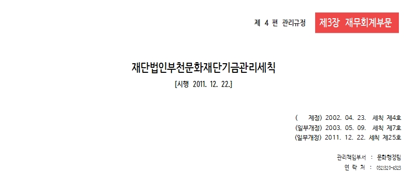 제1조(목적) 이 세칙은 재단법인 부천문화재단(이하 “재단”이라 한다)의 정관 제23조(경비의 충당) 및 회계규정 제5조 제3항(후원금)에 의거 기금의 관