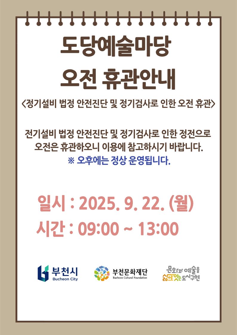 [부천생활문화시설] 도당예술마당 오전 휴관 안내 구분 공지 작성자 시민문화진흥부 작성일 2025.09.10 조회수 2848 파일 목록 이전 글 [공고 제 2025-101호] 2025년 4분기<10월~12월> 부천문화재단 생활문화시설 정기대관 신청 안내 [부천생활문화시설] 10월 휴관 일정 안내(추석연휴 휴관) 다음글