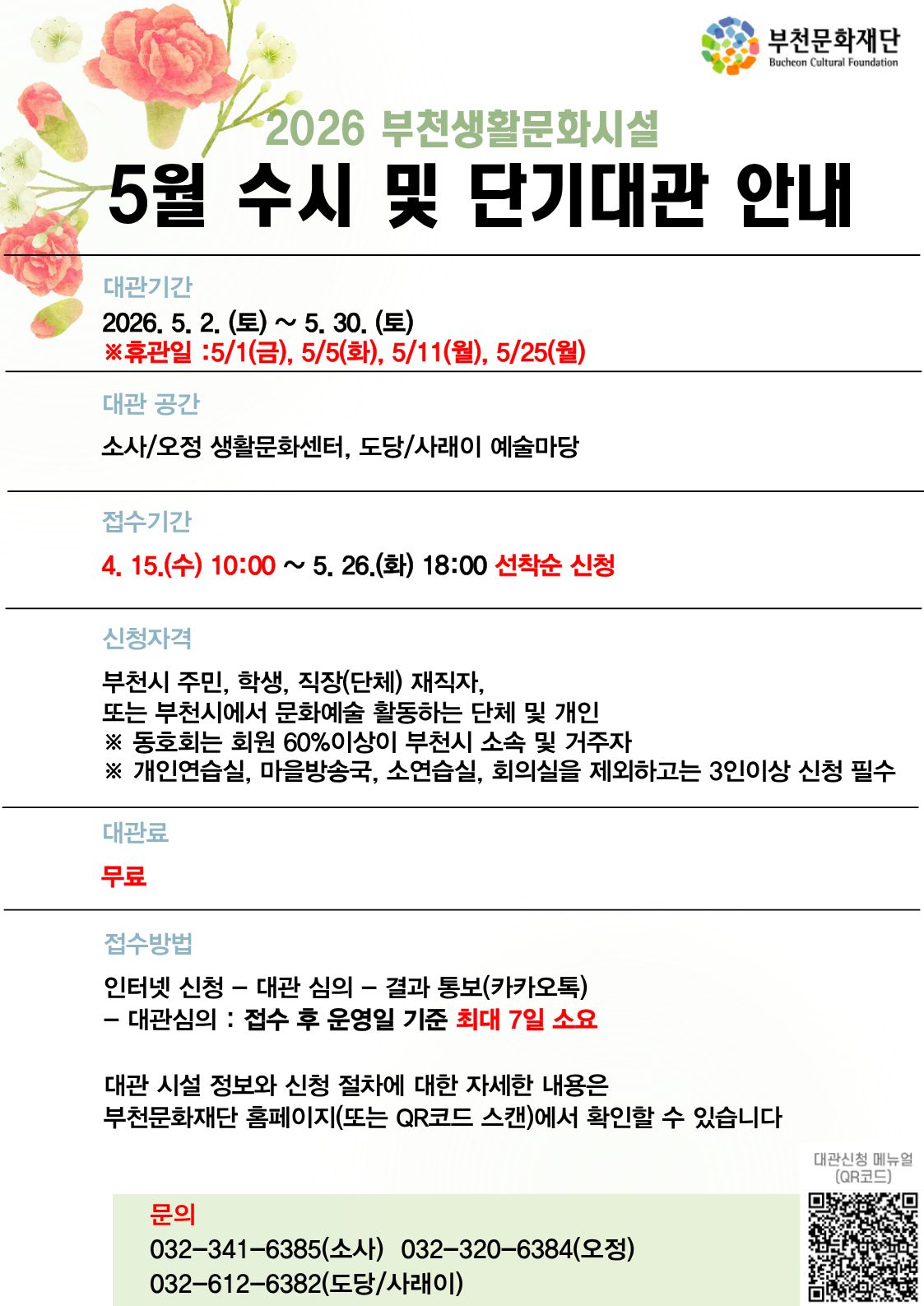 2026년 5월 부천문화재단 생활문화시설 수시•단기 대관 안내 구분 공지 작성자 시민문화진흥부 작성일 2026.03.26 조회수 219 파일 목록 이전 글 [부천생활문화시설] 4월 휴관 일정 안내