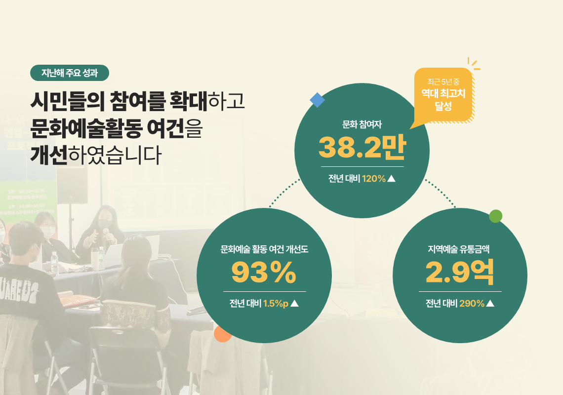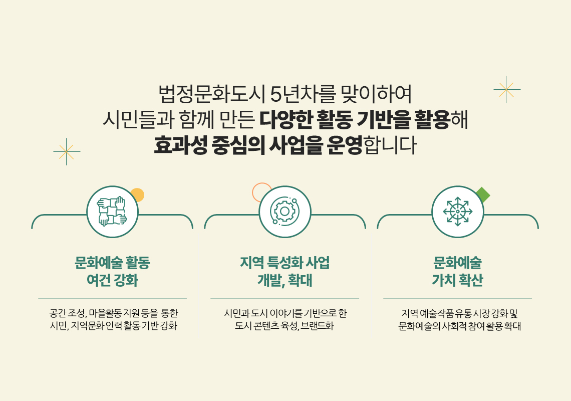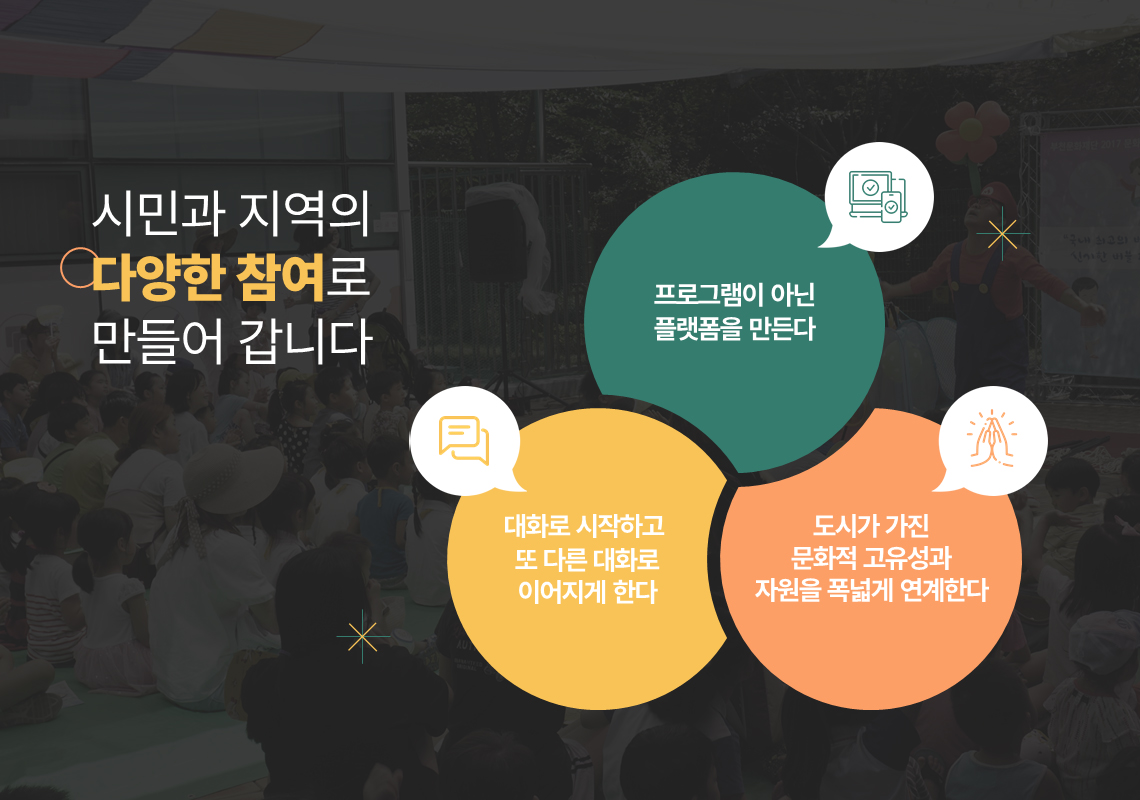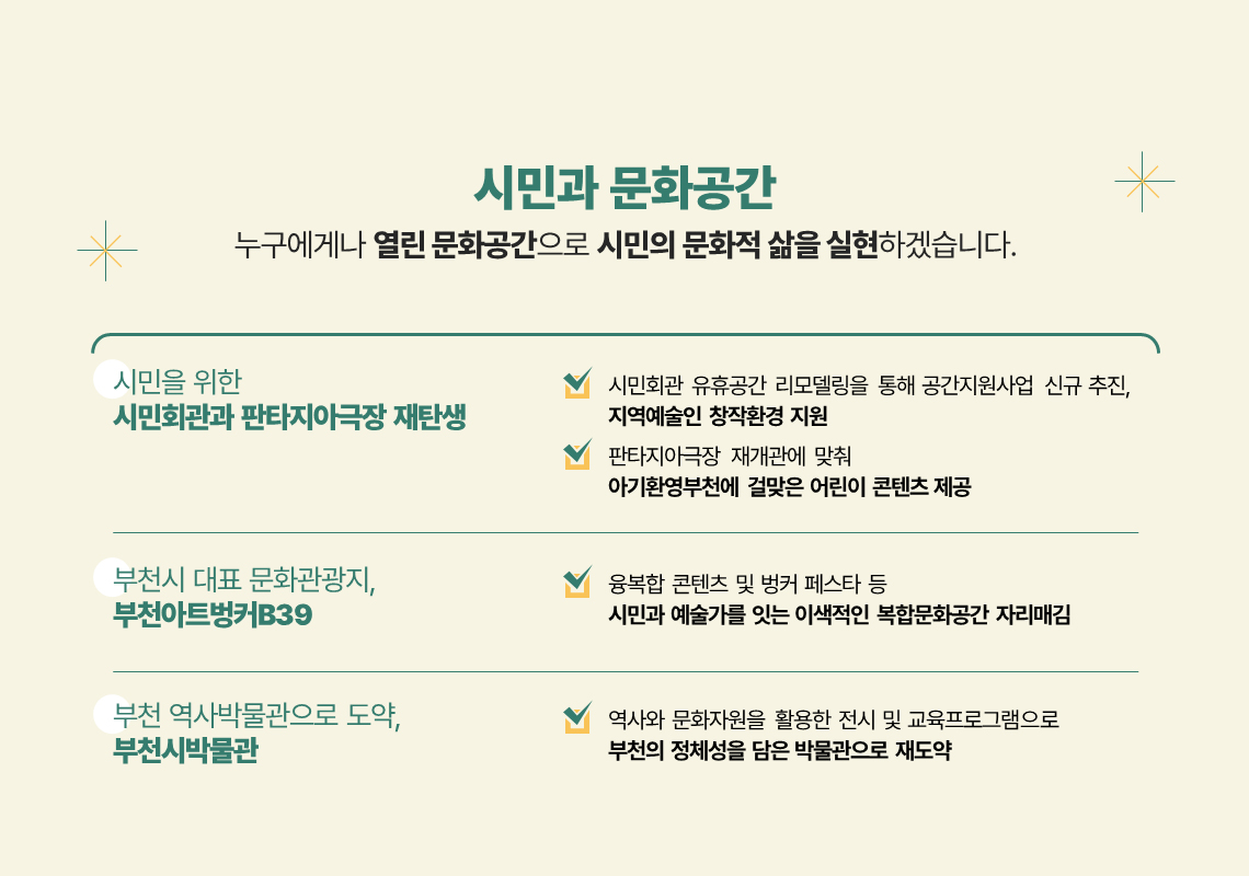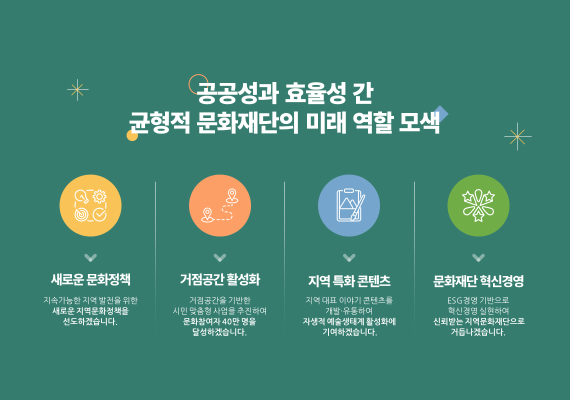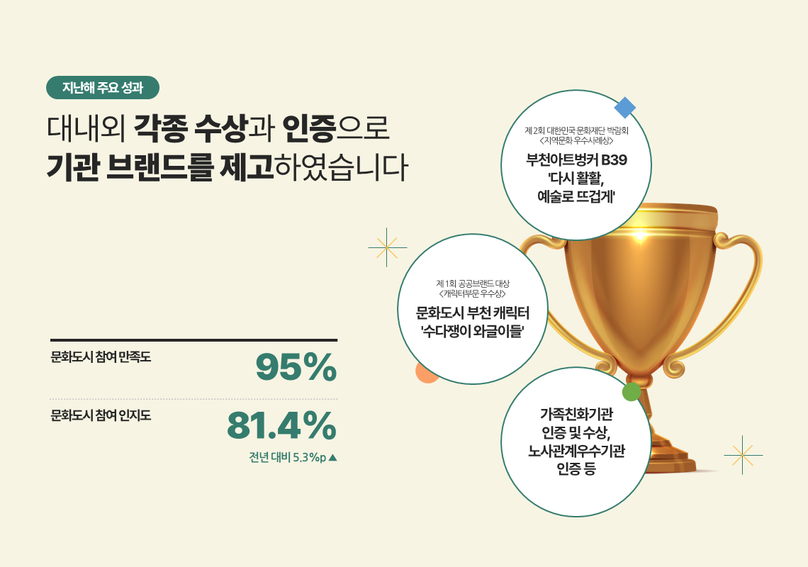 비전 및 정책방향 영상 텍스트 문화비전 2030 문화도시 부천만의 특징과 차별점 숫자로 보는 2023 2024년 목표 및 추진방향 2024년 중점 추진사업 2024년 문화도시 사업의 중점 추진방향 재단 경영철학