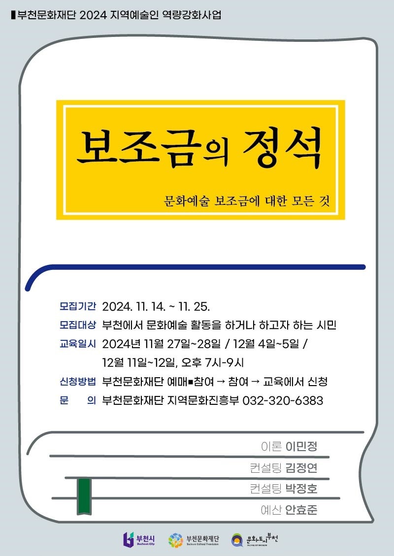 마감 2024 지역예술인 역량강화사업 <보조금의 정석> 교육생 모집 공고 운영일자 2024-11-15 ~ 2024-11-25 모집인원 100 신청인원 69 장소 복사골문화센터 5층 세미나실 참가비 무료 강사명 김정연, 박정호, 안효준, 이민정 연령 없음 문의 032-320-6383 첨부파일 1. 공고문 (보조금의 정석).hwp 목록