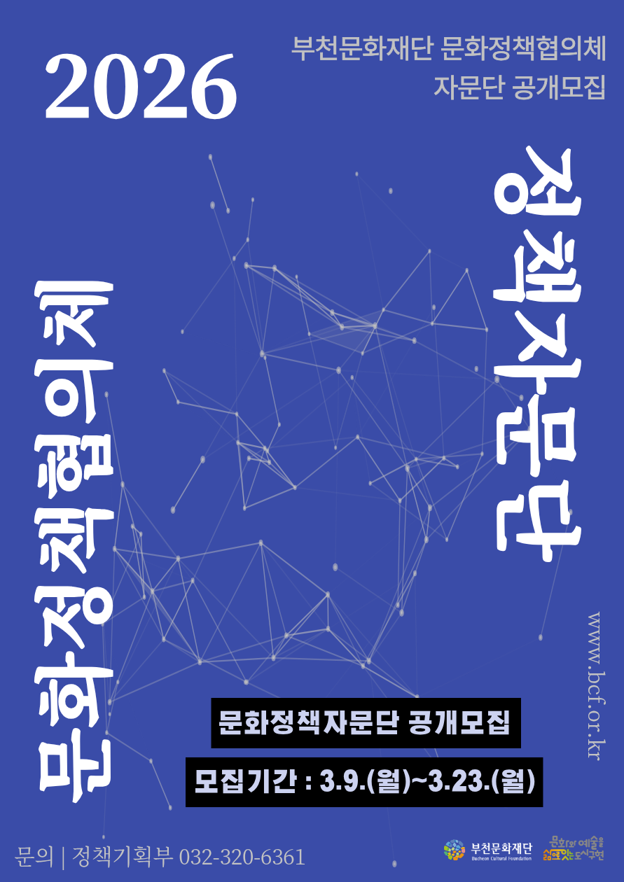 접수중 2026 문화정책협의체-문화정책자문단」 모집 공고 운영일자 2026-03-06 ~ 2026-03-23 모집인원 10 문의 032-320-6361 첨부파일 붙임1_[부천문화재단] 2026 문화정책협의체 정책자문단 공고문.hwp 붙임2_[부천문화재단] 문화정책자문단_지원신청서.hwp 신청하기 목록