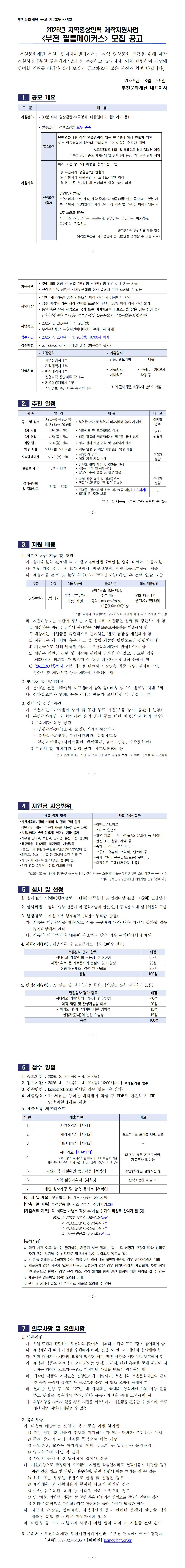 준비중 2026 지역영상인력 제작지원사업 <부천 필름메이커스> 모집 공고 운영일자 2026-04-02 ~ 2026-04-20 문의 첨부파일 부천필름메이커스 모집 공고문.pdf 부천필름메이커스 제출서류 서식.zip 목록