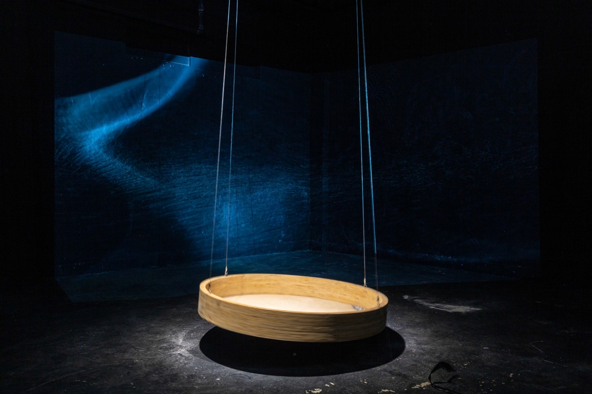 김준서_Void Loop, 2025, 프로젝터, 나무, bldc 모터, 쇠구슬, 마이크, PC, 제너러티브 파티클