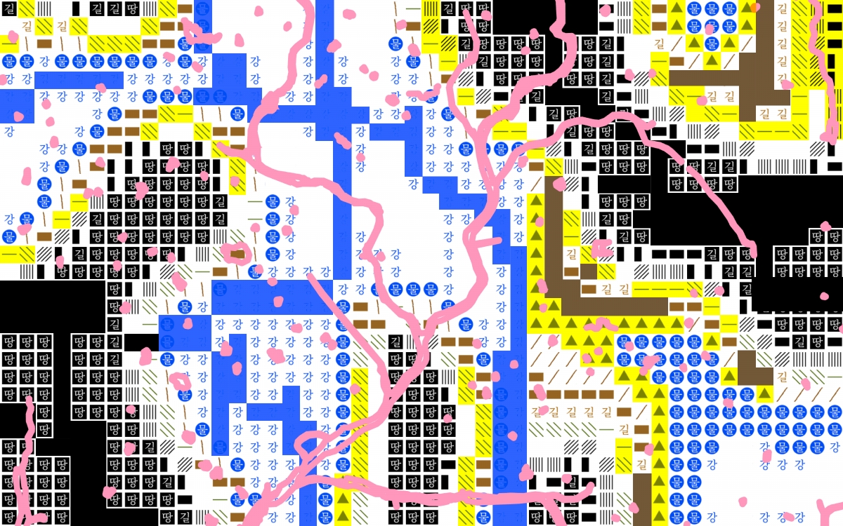 작가는 현재와 과거 사이에서 “사라진” 것들에 관심이 많다. <글자를 입은 소리들이 모인 지도>는 지금은 사라지거나 잊힌 땅의 이름들에서 땅이 품고있는 기억들을 되살려낸 작품이다. 낯선 이름을 작품 위에 올리는 행위는 잃어버린 언어와 장소를 복원하는 감각적 의례이자, 하나의 기억 장치가 된다. 전시가 말하는 ‘대홍수’는 단지 물리적 재해가 아니라, 문명의 단절과 기억의 소멸을 동반하는 재난적 사건이다. 박고은은 우리가 어떻게 기억을 되살리고, 사라진 것들을 다시 말할 수 있는가를 묻는다. 작가는 말없이 사라진 이름들을 수면 위로 다시 올려놓음으로써, 홍수에 휩쓸려 간 것들—땅의 언어, 지역의 정체성, 삶의 이야기—을 기록하고 기억하는 태도를 제시한다. 사라진 것들에 대한 진솔하고 집요한 탐구를 바탕으로, 우리가 살아가는 이 시대는 앞으로 어떻게 기억될 것인가에 대해 생각해보게 한다.