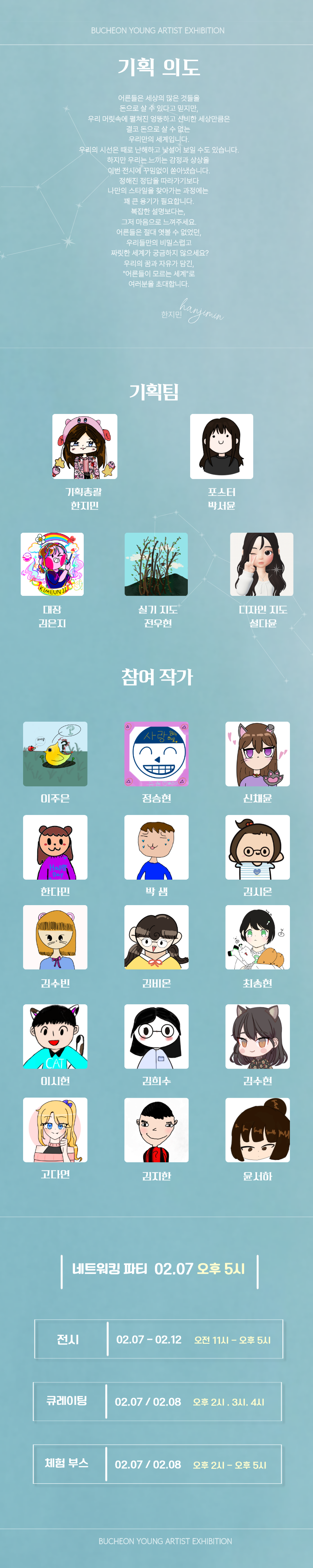 2026030320260207공연종료 2026 부천문화재단 협력전시 《어른들은 모르는 세계》 기간 2026-02-07 ~ 2026-02-12 장소 부천시민회관 갤러리 대상 누구나 가격 무료 주최 주최: 해피화인아트 / 협력: (재)부천문화재단 문의 032-614-3877 상세정보 기타정보 목록