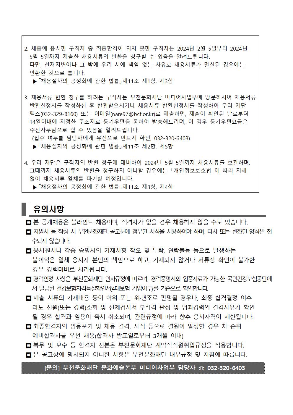[공고 제2024-01호] 부천문화재단 미디어사업부(판타스틱큐브) 시간제계약직 모집 공고 구분 채용 작성자 미디어예술교육부 작성일 2024.01.15 조회수 21100 파일 1. 공고문.pdf 다운로드 2. 입사지원서(개인정보제공동의서) 서식.hwp 다운로드 3. 채용서류반환청구서.hwp 다운로드 목록 이전 글 영상정보처리기기(CCTV)설치에 따른 행정예고 [공고 제2023-139호] 2024년도 제1회 부천문화재단 공개채용(기간제근로자) 모집 재공고 다음글
