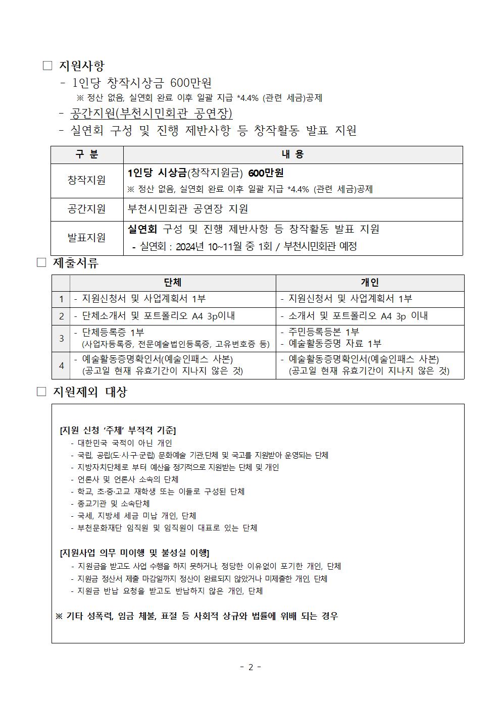 [공고 제2024-61호] 공간플러스 <예술창작지원활동> 지원사업 참여자 모집 공고 구분 모집 작성자 공연기획운영부 작성일 2024.04.22 조회수 22752 파일 붙임1.2024+공간플러스+예술창작활동+지원+사업+공고.hwp 다운로드 붙임2.2024+공간플러스+예술창작활동+지원+사업_신청서.hwp 다운로드 목록 이전 글 [공고 제2024-60호] 2024년 부천문화재단 공연장안내원(시간제근로자) 3기 모집 공고 부천시민미디어센터 마을미디어 교육생 모집 다음글