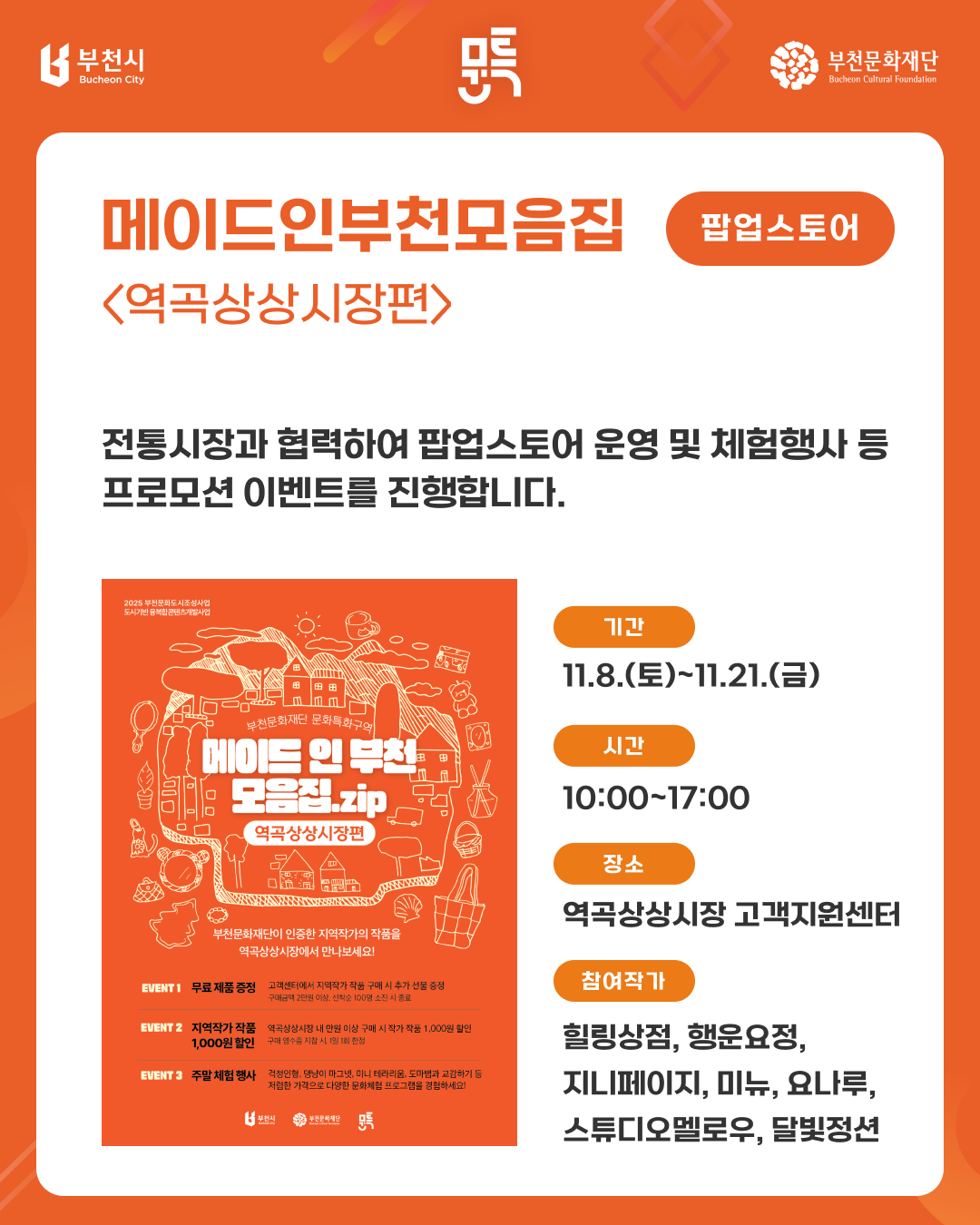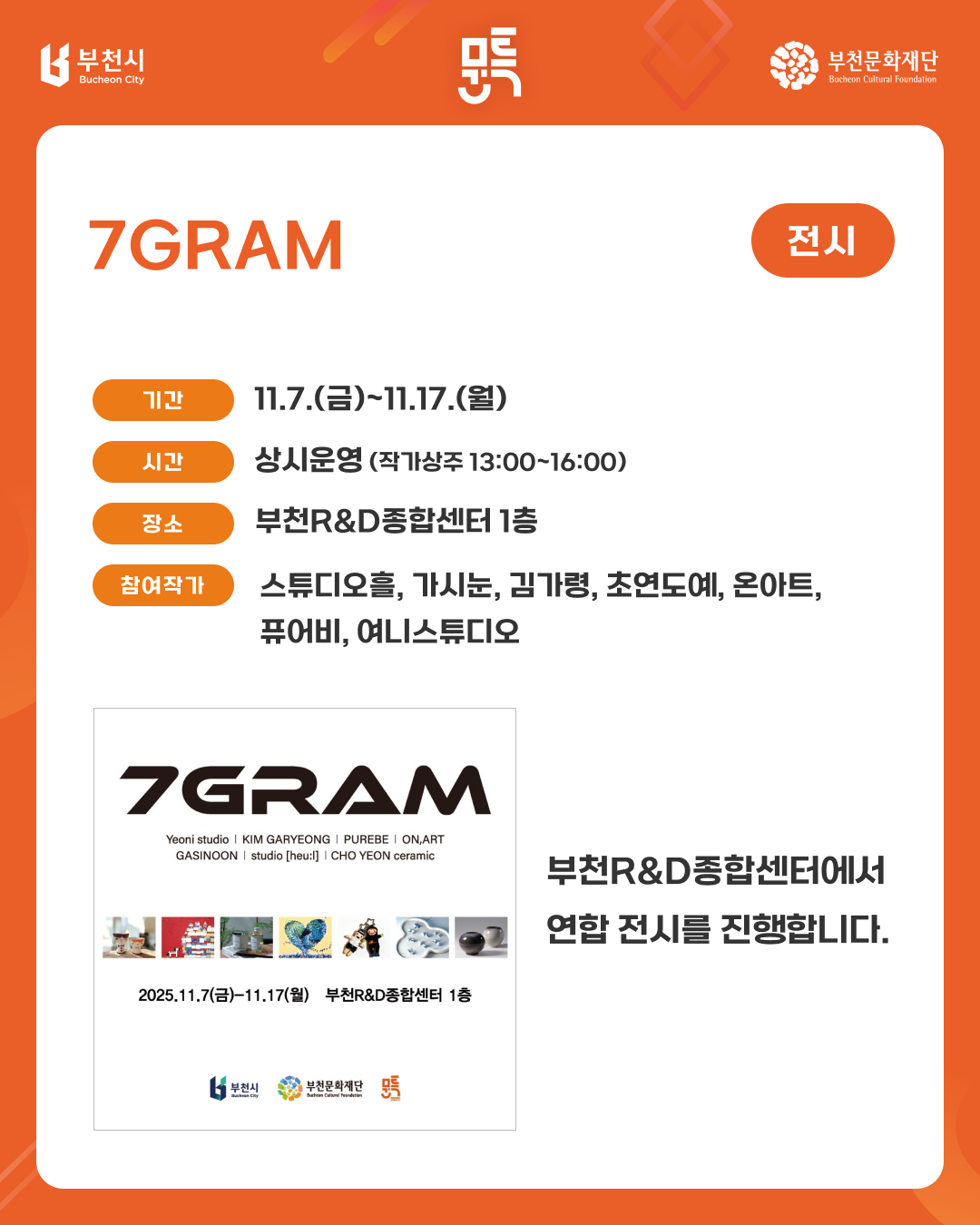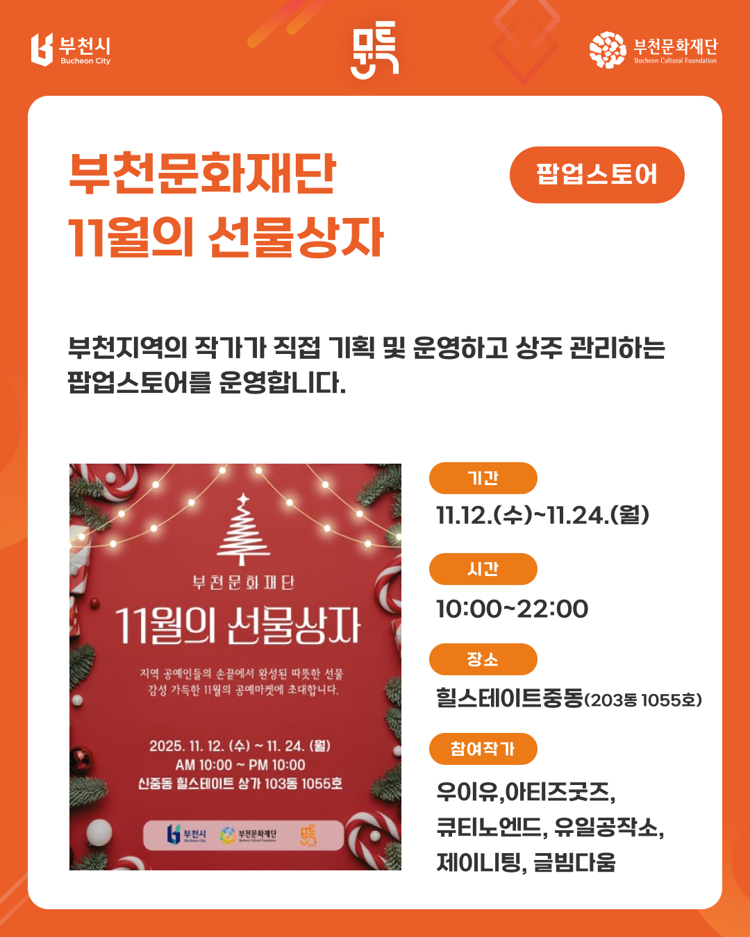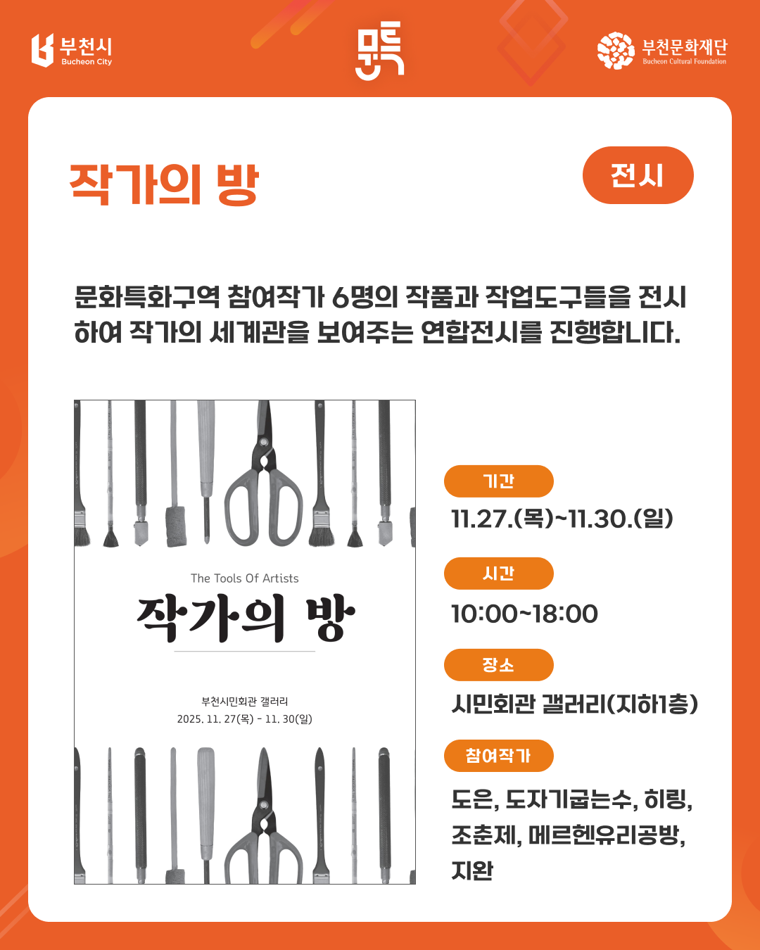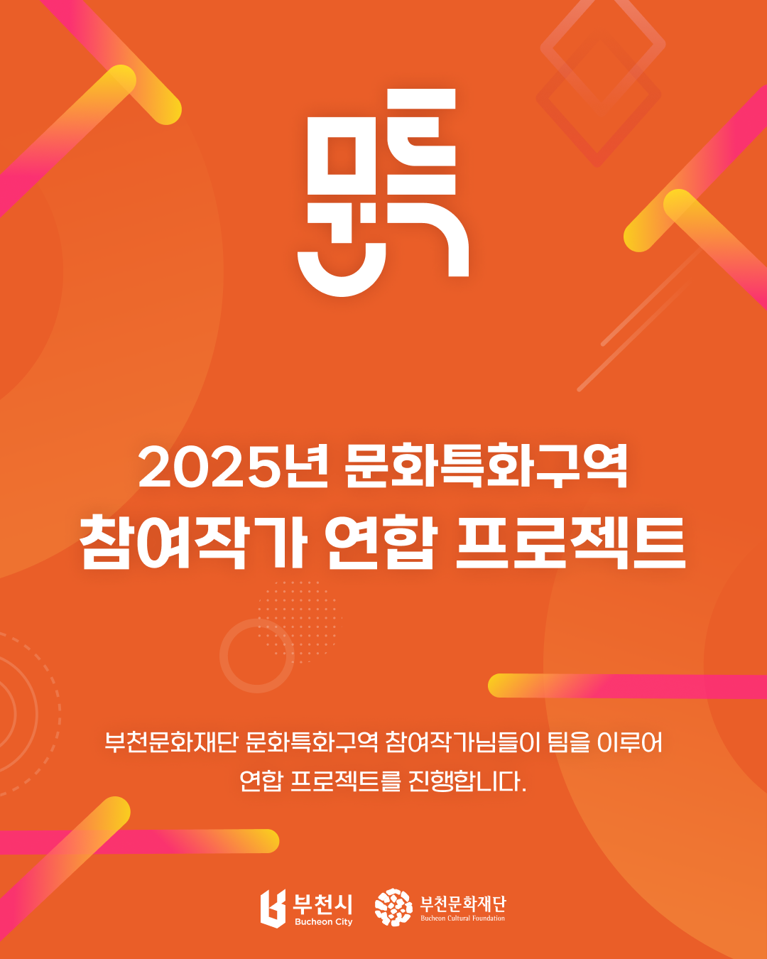 [부천문화특화구역] 참여작가 연합프로젝트 안내 구분 행사 작성자 도시문화창작부 작성일 2025.11.12 조회수 6694 파일 목록 이전 글 [공고 제2025-137호] 2025년 부천문화재단 불용물품 매각 재공고 12월 <수요시네마> 및 추후 상영 안내 다음글