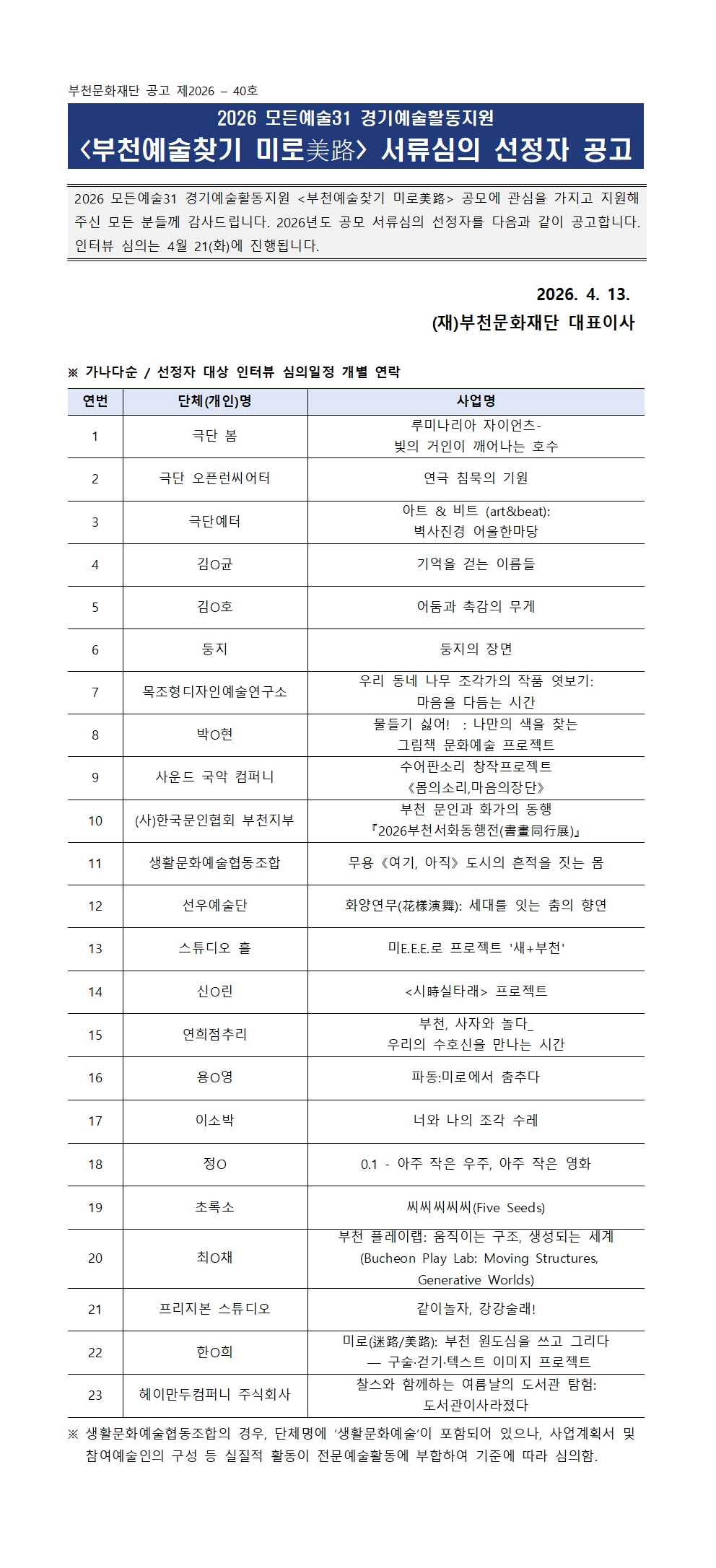 [공고 제2026-40호] 2026 모든예술31 경기예술활동지원 <부천예술찾기 미로美路> 선정자 공고 구분 발표 작성자 문화예술창작부 작성일 2026.04.13 조회수 229 파일 2026 부천예술찾기 미로 서류심의 선정자 공고문.pdf 다운로드 목록 이전 글 연극 <미리내 삼대>, 창작발레컬 <달빛 윤슬은 파도 위를 춤춘다> 공연 안내