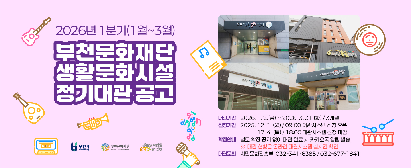 공지 [부천생활문화시설] 12월 휴관 일정 안내 2025-11-11 14:39:26 공지 2025년 12월 부천문화재단 생활문화시설 수시•단기 대관 안내 2025-11-11 14:37:37 공지 [공고 제 2025-136호] 2026년 1분기 [1월~3월] 부천문화재단 생활문화시설 정기대관 신청 안내 2025-11-10 10:58:19 공지 2025년 10월 부천문화재단 생활문화시설 수시•단기 대관 안내 2025-09-10 11:01:59 이전 슬라이드 다음 슬라이드 1 /
