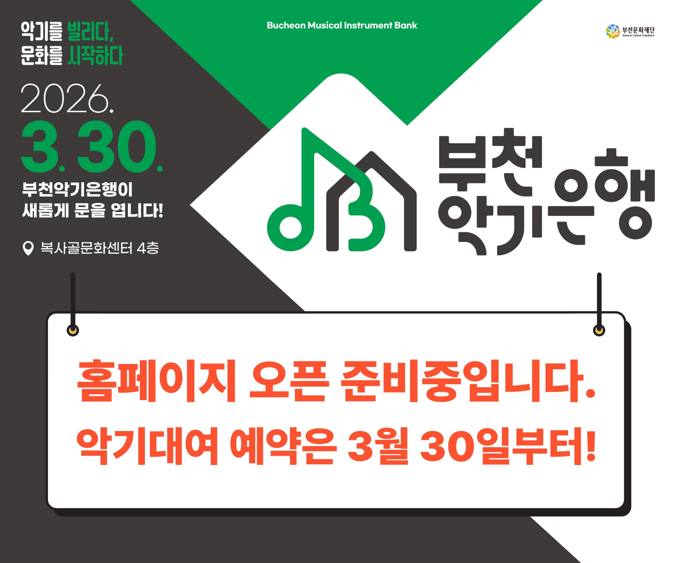 2026.03. 17 2026 부천악기은행 단시간(시간제)근로자 최종합격자 공고 2026.03. 17 [공고 제2026-026호] 2026 부천악기은행 단시간(시간제)근로자 채용 면접일정 공고 2026.03. 17 [부천악기은행] 오픈이벤트 “따끈따끈 새 악기의 첫 주인공을 찾아서!” 더보기