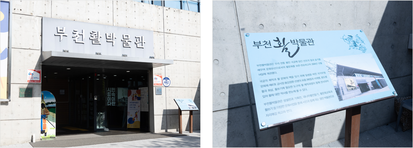다음 장소는 부천활박물관입니다. 이곳에는 국가무형문화재 제47호 궁시장 김장환 선생님의 유품과 약 500여 점의 활 관련 자료를 소장하고 있답니다. 부천에서 200년 가까이 이어오던 궁도의 맥을 활박물관이 이어가고 있는 것이죠. 평소에도 대나무 활 만들기 체험 등 프로그램에 참여할 수 있어요. 활에 관한 재미있는 기획 전시 관람할 수 있고요.