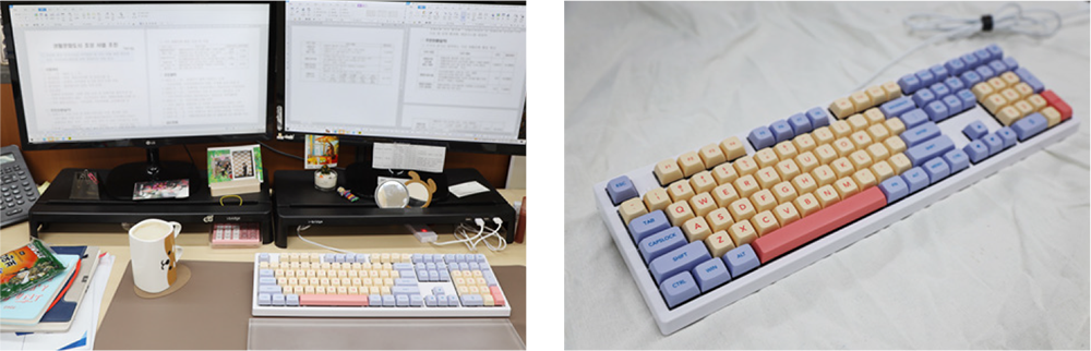 입사 5년 차 기획홍보부 강경희 대리는 입사한 이후 줄곧 같은 부서에서 일해왔다. 올해는 조직경영 관련 업무를 수행하며 태어나 가장 바쁜 시간을 보냈다. 그만큼 힘들었지만 ‘힘들지 않으면 배움이 없으며, 경험에서 나오는 것 중에 나쁜 것은 없다’는 생각으로 1년을 지냈다. 1년 동안 업무에 부딪히며 성장한 것은 분명하지만, ‘나와 주변에 너그러움’을 가지지 못한 것 같아 아쉬운 마음 또한 생긴다. 강 대리의 책상을 굳건히 지키는 것은 바로 ‘키보드’이다. 키캡까지 새로 구매해 꾸밀 만큼 애정이 듬뿍 깃들어 있다. 보고서 작성 등 키보드와 씨름하는 시간이 많아, 그 시간을 즐겁게 지내고 싶은 마음에 구매한 키보드라고 한다. ‘직접 구매’한 행위에는 또 다른 의미가 담겨있다. 주어진 일만 수동적으로 하는 것이 아니라 능동적으로 일을 대하고자 하는 마음이다. 아침에 출근하며 건네는 ‘안녕’, 퇴근하며 전하는 ‘안녕’을 떠올리며 강 대리는 키보드에 ‘안녕’ 라는 이름을 붙여주었다. 강 대리의 2023년은 ‘안녕’ 라는 의미 그대로 아무 탈 없이 편안한 한 해가 되길 응원해본다.