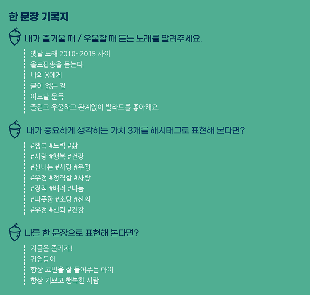 도토리방에 모인 한 문장 기록지의 이야기를 살짝 들여다볼까요. 자신의 기분을 대변하는 노래부터 소중하게 생각하는 삶의 가치도 이야기해주셨네요. 나를 표현한 문장을 들여다보니 부천에는 귀염둥이부터 자연바라기까지 정말 다양한 시민들이 모여 있다는 것을 다시 한번 느꼈어요. ‘고민을 잘 들어주는 아이’는 친구의 고민만 듣다가 지치지 않기를 그리고 ‘꿈을 좇는 아름다운 사람’은 좇는 꿈도 꼭 이루시길 바라봅니다.
