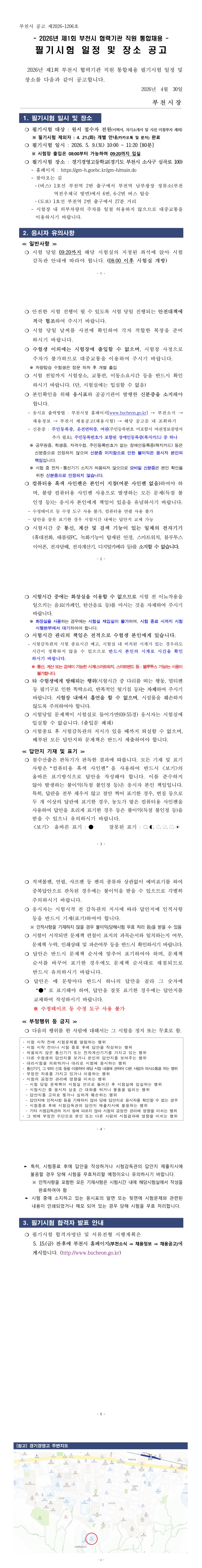 [부천시 공고 제2026-1206호] 2026년 제1회 부천시 협력기관 직원 통합채용 필기시험 일정 및 장소 공고