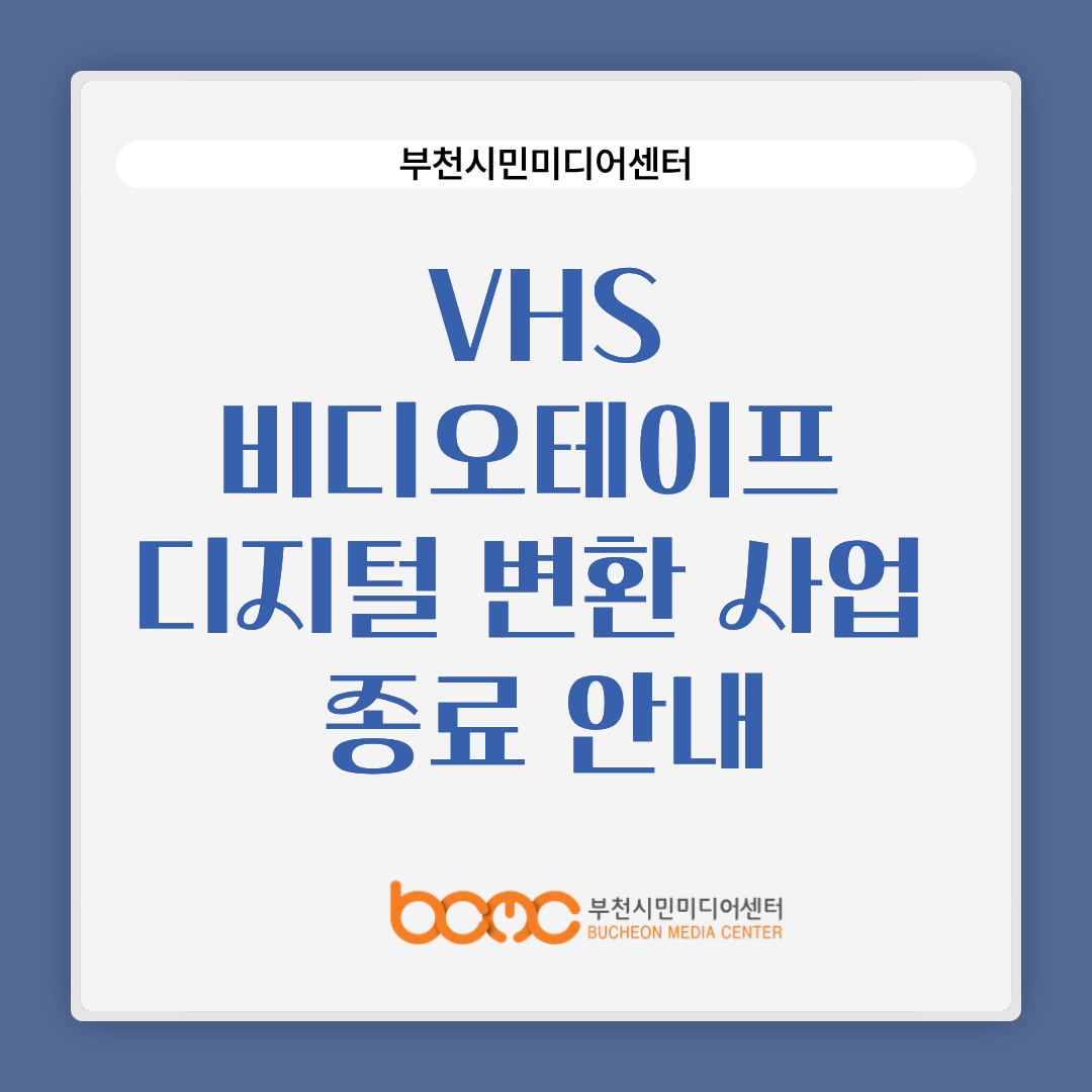 공지 더보기 VHS비디오테이프 디지털 변환 사업 종료 안내 2025-12-26 15:18:26 부천시민미디어센터 12.20.~ 12.31. 대관·대여 이용시, 선결제 안내 2025-12-03 18:41:47 12월 <수요시네마> 및 추후 상영 안내 2025-11-25 13:31:06 '찾아가는 미디어임팩트 상영회' 참여단체 모집 2025-10-29 16:24:54 수요시네마 1/1 현재 신청기간에 해당하는 영화가 없습니다.